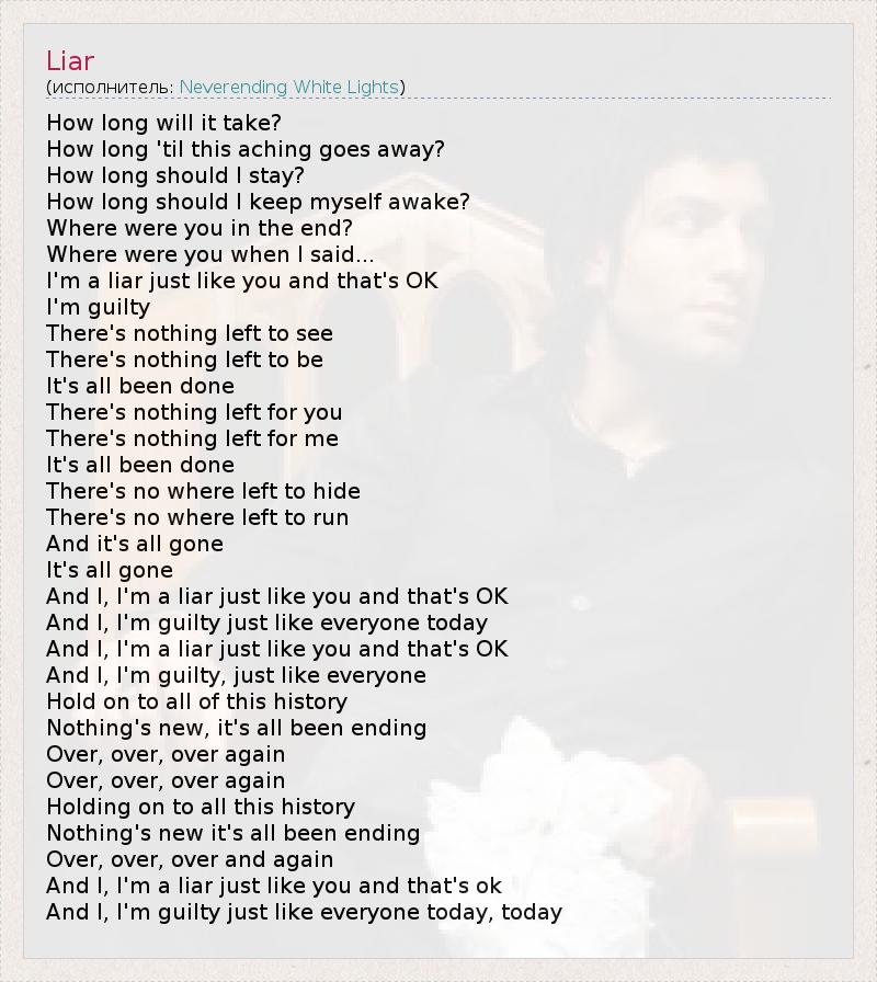 How long will it take? How long 'til this aching goes away? How long should I stay? How long should I keep myself awake? Where were you in the end? Where were you when I said... I'm a liar just like you and that's OK I'm guilty There's nothing left to see There's nothing left to be It's all been done There's nothing left for you There's nothing left for me It's all been done There's no where left to hide There's no where left to run And it's all gone It's all gone And I, I'm a liar just like you and that's OK And I, I'm guilty just like everyone today And I, I'm a liar just like you and that's OK And I, I'm guilty, just like everyone Hold on to all of this history Nothing's new, it's all been ending Over, over, over again Over, over, over again Holding on to all this history Nothing's new it's all been ending Over, over, over and again And I, I'm a liar just like you and that's ok And I, I'm guilty just like everyone today, today