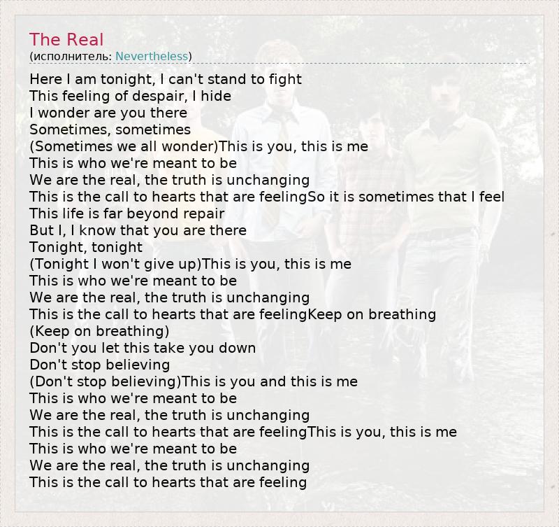 Это интересно:Nevertheless (сокращенно NTL) - christian группа из Тенесси. Название было взято из Евангелия от Луки: "Симон сказал Ему в ответ: Наставник! мы трудились всю ночь и ничего не поймали, но по слову Твоему (Nevertheless) закину сеть." Песни "Live Like We're Alive", "The Real" и "Cross... продолжение