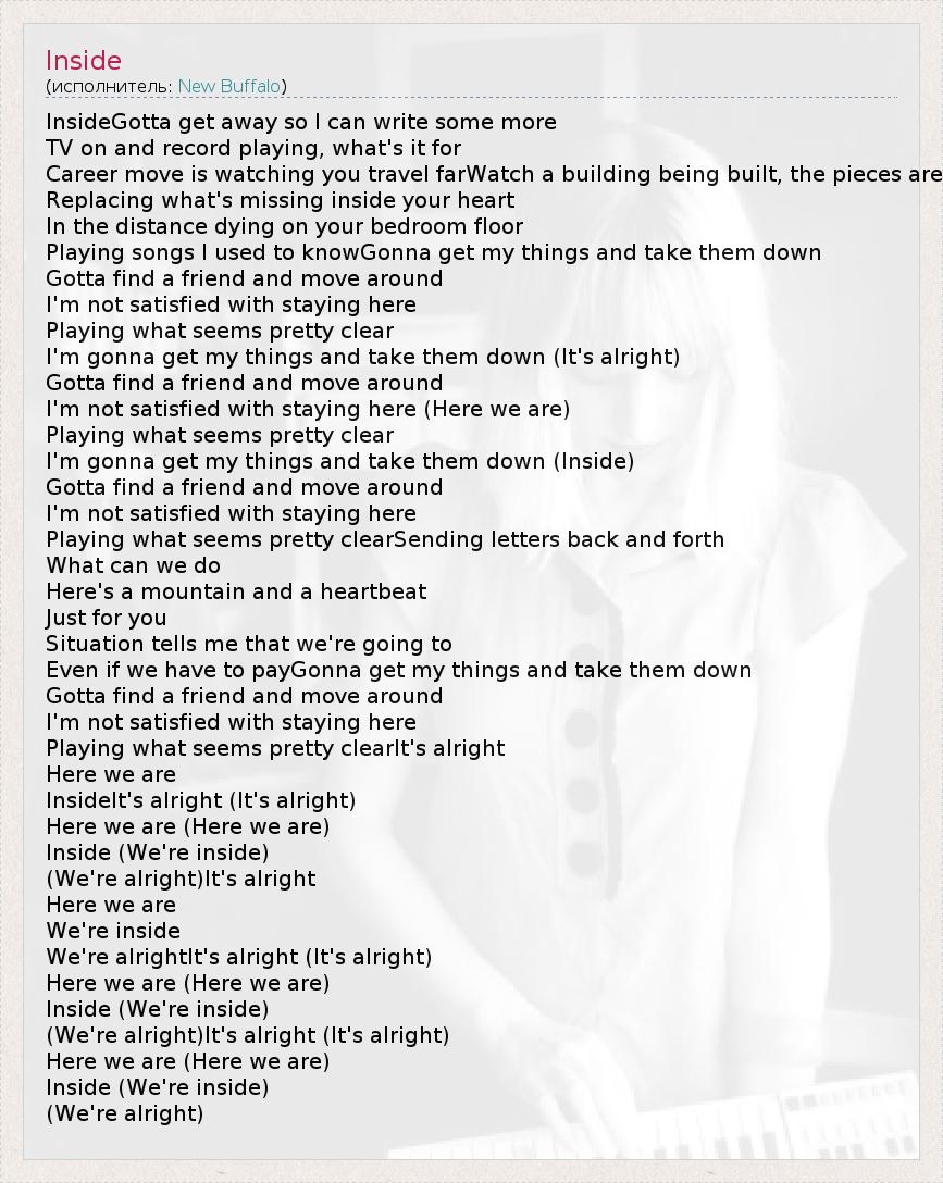 InsideGotta get away so I can write some more TV on and record playing, what's it for Career move is watching you travel farWatch a building being built, the pieces are Replacing what's missing inside your heart In the distance dying on your bedroom floor Playing songs I used to knowGonna get my things and take them down Gotta find a friend and move around I'm not satisfied with staying here Playing what seems pretty clear I'm gonna get my things and take them down (It's alright) Gotta find a friend and move around I'm not satisfied with staying here (Here we are) Playing what seems pretty clear I'm gonna get my things and take them down (Inside) Gotta find a friend and move around I'm not satisfied with staying here Playing what seems pretty clearSending letters back and forth What can we do Here's a mountain and a heartbeat Just for you Situation tells me that we're going to Even if we have to payGonna get my things and take them down Gotta find a friend and move around I'm not satisfied with staying here Playing what seems pretty clearIt's alright Here we are InsideIt's alright (It's alright) Here we are (Here we are) Inside (We're inside) (We're alright)It's alright Here we are We're inside We're alrightIt's alright (It's alright) Here we are (Here we are) Inside (We're inside) (We're alright)It's alright (It's alright) Here we are (Here we are) Inside (We're inside) (We're alright)