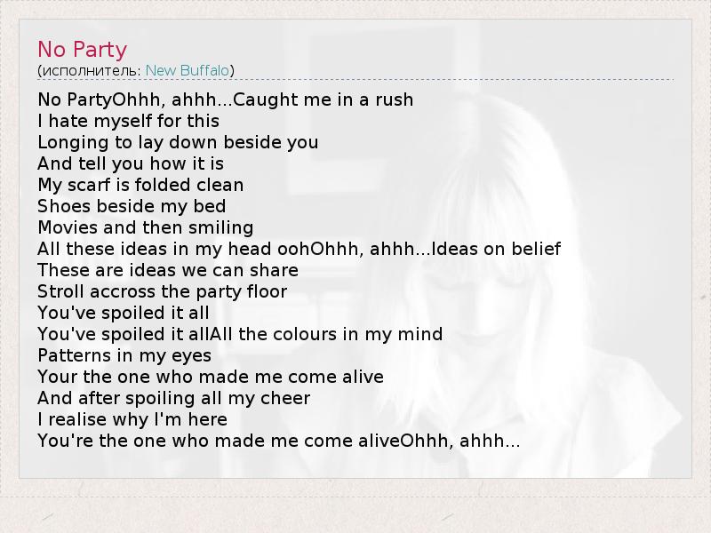 No PartyOhhh, ahhh...Caught me in a rush I hate myself for this Longing to lay down beside you And tell you how it is My scarf is folded clean Shoes beside my bed Movies and then smiling All these ideas in my head oohOhhh, ahhh...Ideas on belief These are ideas we can share Stroll accross the party floor You've spoiled it all You've spoiled it allAll the colours in my mind Patterns in my eyes Your the one who made me come alive And after spoiling all my cheer I realise why I'm here You're the one who made me come aliveOhhh, ahhh...