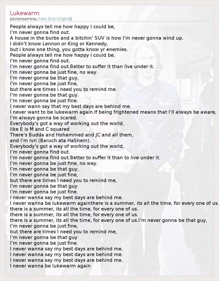 People always tell me how happy I could be, I'm never gonna find out. A house in the burbs and a bitchin' SUV is how I'm never gonna wind up. I didn't know Lennon or King or Kennedy, but i know one thing, you gotta know yr enemies. People always tell me how happy I could be, I'm never gonna find out. I'm never gonna find out.Better to suffer it than live under it. I'm never gonna be just fine, no way. I'm never gonna be that guy, I'm never gonna be just fine, but there are times i need you to remind me. I'm never gonna be that guy. I'm never gonna be just fine. I never wann say that my best days are behind me. I never want to be lukewarm again.If being frightened means that I'll always be aware, I'm always gonna be scared. Everybody's got a way of working out the world, like E is M and C squared There's Budda and Hohammed and JC and all them, and I'm ivri (Baruch ata HaShem). Everybody's got a way of working out the world, I'm never gonna find out. I'm never gonna find out.Better to suffer it than to live under it. I'm never gonna be just fine, no way. I'm never gonna be that guy, I'm never gonna be just fine, but there are times I need you to remind me, I'm never gonna be that guy I'm never gonna be just fine. I never wanna say my best days are behind me. I never wanna be lukewarm againthere is a summer, its all the time, for every one of us. there is a summer, its all the time, for every one of us. there is a summer, its all the time, for every one of us. there is a summer, its all the time, for every one of us.I'm never gonna be that guy, I'm never gonna be just fine, but there are times I need you to remind me, I'm never gonna be that guy I'm never gonna be just fine. I never wanna say my best days are behind me. I never wanna say my best days are behind me. I never wanna say my best days are behind me. I never wanna be lukewarm again