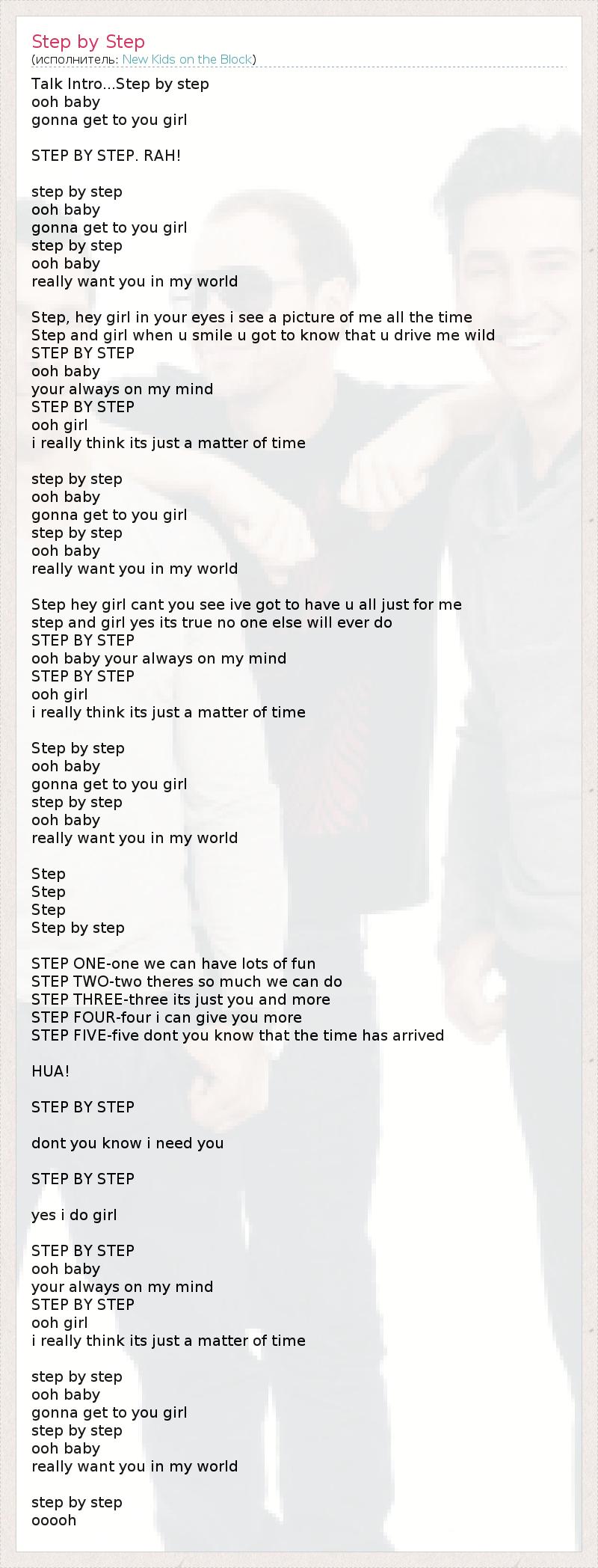 Talk Intro...Step by step ooh baby gonna get to you girl STEP BY STEP. RAH! step by step ooh baby gonna get to you girl step by step ooh baby really want you in my world Step, hey girl in your eyes i see a picture of me all the time Step and girl when u smile u got to know that u drive me wild STEP BY STEP ooh baby your always on my mind STEP BY STEP ooh girl i really think its just a matter of time step by step ooh baby gonna get to you girl step by step ooh baby really want you in my world Step hey girl cant you see ive got to have u all just for me step and girl yes its true no one else will ever do STEP BY STEP ooh baby your always on my mind STEP BY STEP ooh girl i really think its just a matter of time Step by step ooh baby gonna get to you girl step by step ooh baby really want you in my world Step Step Step Step by step STEP ONE-one we can have lots of fun STEP TWO-two theres so much we can do STEP THREE-three its just you and more STEP FOUR-four i can give you more STEP FIVE-five dont you know that the time has arrived HUA! STEP BY STEP dont you know i need you STEP BY STEP yes i do girl STEP BY STEP ooh baby your always on my mind STEP BY STEP ooh girl i really think its just a matter of time step by step ooh baby gonna get to you girl step by step ooh baby really want you in my world step by step ooooh