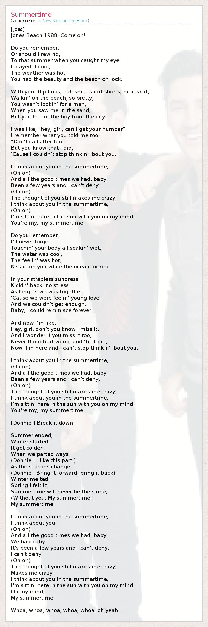 [Joe:] Jones Beach 1988. Come on! Do you remember, Or should I rewind, To that summer when you caught my eye, I played it cool, The weather was hot, You had the beauty and the beach on lock. With your flip flops, half shirt, short shorts, mini skirt, Walkin' on the beach, so pretty, You wasn't lookin' for a man, When you saw me in the sand, But you fell for the boy from the city. I was like, "hey, girl, can I get your number" I remember what you told me too, "Don't call after ten" But you know that I did, 'Cause I couldn't stop thinkin' 'bout you. I think about you in the summertime, (Oh oh) And all the good times we had, baby, Been a few years and I can't deny, (Oh oh) The thought of you still makes me crazy, I think about you in the summertime, (Oh oh) I'm sittin' here in the sun with you on my mind. You're my, my summertime. Do you remember, I'll never forget, Touchin' your body all soakin' wet, The water was cool, The feelin' was hot, Kissin' on you while the ocean rocked. In your strapless sundress, Kickin' back, no stress, As long as we was together, 'Cause we were feelin' young love, And we couldn't get enough. Baby, I could reminisce forever. And now I'm like, Hey, girl, don't you know I miss it, And I wonder if you miss it too, Never thought it would end 'til it did, Now, I'm here and I can't stop thinkin' 'bout you. I think about you in the summertime, (Oh oh) And all the good times we had, baby, Been a few years and I can't deny, (Oh oh) The thought of you still makes me crazy, I think about you in the summertime, I'm sittin' here in the sun with you on my mind. You're my, my summertime. [Donnie:] Break it down. Summer ended, Winter started, It got colder, When we parted ways, (Donnie : I like this part.) As the seasons change. (Donnie : Bring it forward, bring it back) Winter melted, Spring I felt it, Summertime will never be the same, (Without you. My summertime.) My summertime. I think about you in the summertime, I think about you (Oh oh) And all the good times we had, baby, We had baby It's been a few years and I can't deny, I can't deny (Oh oh) The thought of you still makes me crazy, Makes me crazy I think about you in the summertime, I'm sittin' here in the sun with you on my mind. On my mind, My summertime. Whoa, whoa, whoa, whoa, whoa, oh yeah.
