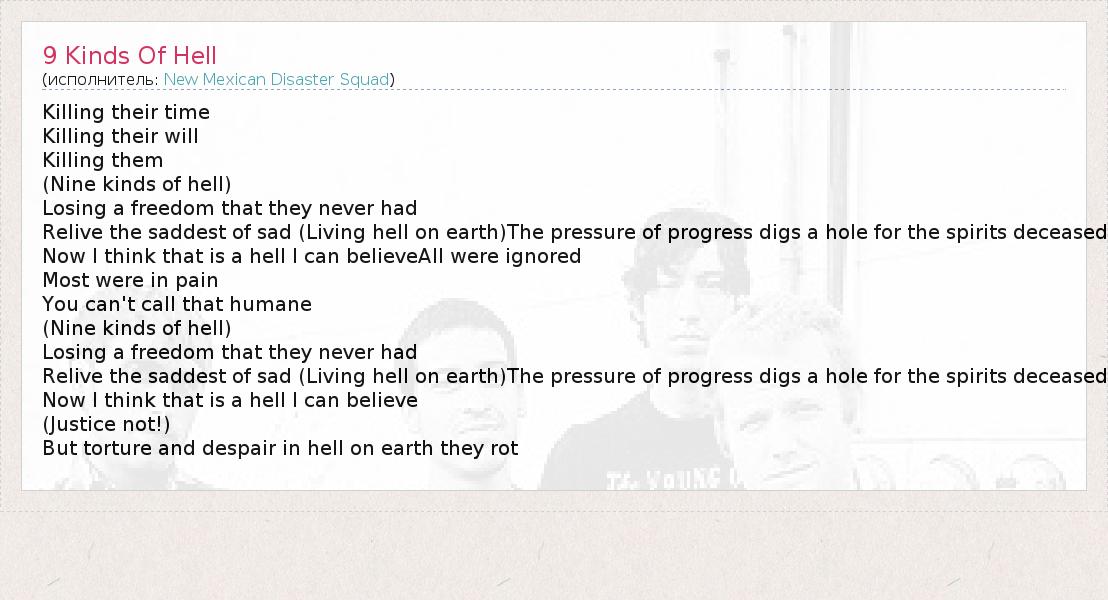 Это интересно:New mexican disaster squad образовались в 1999 в Орландо, штат Флорида. На них оказали большое влияние такие группы как Minor Threat, Dag Nasty, Adolescents, Black Flag, Bad Brains, The Damned, Government Issue. Их музыку можно озарактеризовать как смесь Вашинктонского и Калифорнийского хардкора начала - середины 80-ых. В 99 группа выпустила первую пластинку "Weapons and Equipment of Counter Terrorism". Группа продолжала выступать и в следующем году было... продолжение