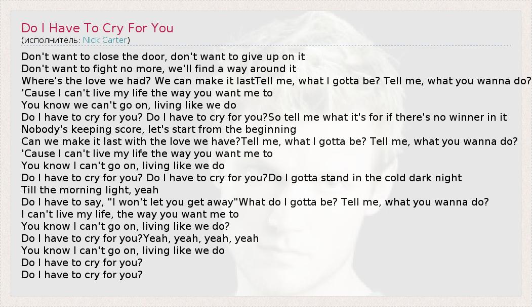 А как ты думаешь, о чем песня "Do I Have To Cry For You" ?