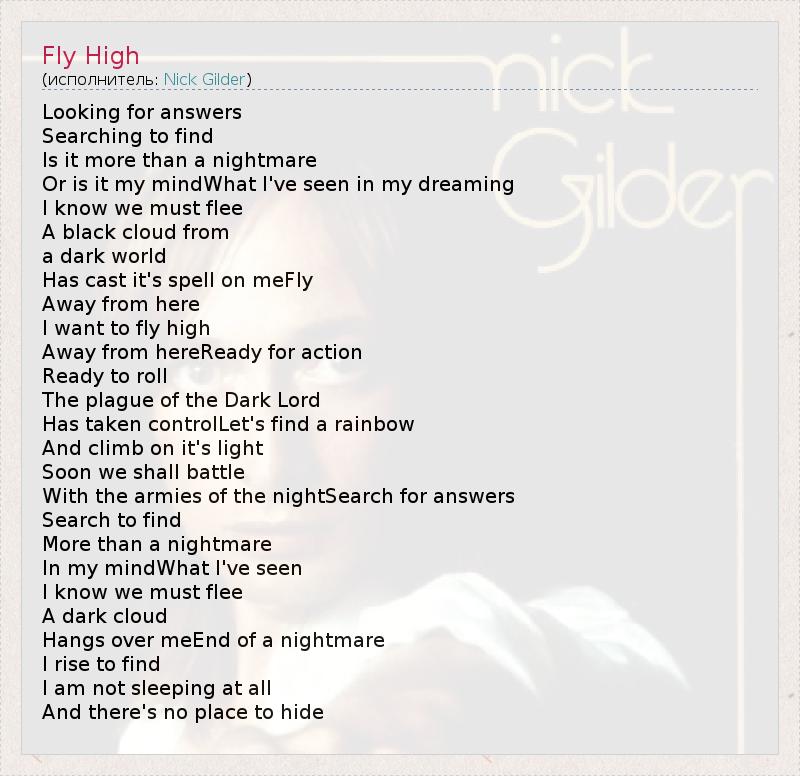 Looking for answers Searching to find Is it more than a nightmare Or is it my mindWhat I've seen in my dreaming I know we must flee A black cloud from a dark world Has cast it's spell on meFly Away from here I want to fly high Away from hereReady for action Ready to roll The plague of the Dark Lord Has taken controlLet's find a rainbow And climb on it's light Soon we shall battle With the armies of the nightSearch for answers Search to find More than a nightmare In my mindWhat I've seen I know we must flee A dark cloud Hangs over meEnd of a nightmare I rise to find I am not sleeping at all And there's no place to hide