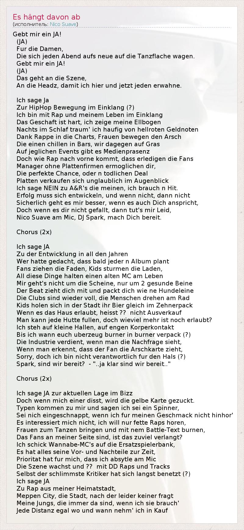 Gebt mir ein JA! (JA) Fur die Damen, Die sich jeden Abend aufs neue auf die Tanzflache wagen. Gebt mir ein JA! (JA) Das geht an die Szene, An die Headz, damit ich hier und jetzt jeden erwahne. Ich sage Ja Zur HipHop Bewegung im Einklang (?) Ich bin mit Rap und meinem Leben im Einklang Das Geschaft ist hart, ich zeige meine Ellbogen Nachts im Schlaf traum' ich haufig von hellroten Geldnoten Dank Rappe in die Charts, Frauen bewegen den Arsch Die einen chillen in Bars, wir dagegen auf Gras Auf jeglichen Events gibt es Medienprasenz Doch wie Rap nach vorne kommt, dass erledigen die Fans Manager ohne Plattenfirmen ermoglichen dir, Die perfekte Chance, oder n todlichen Deal Platten verkaufen sich unglaublich im Augenblick Ich sage NEIN zu A&R's die meinen, ich brauch n Hit. Erfolg muss sich entwickeln, und wenn nicht, dann nicht Sicherlich geht es mir besser, wenn es auch Dich anspricht, Doch wenn es dir nicht gefallt, dann tut's mir Leid, Nico Suave am Mic, DJ Spark, mach Dich bereit. Chorus (2x) Ich sage JA Zu der Entwicklung in all den Jahren Wer hatte gedacht, dass bald jeder n Album plant Fans ziehen die Faden, Kids sturmen die Laden, All diese Dinge halten einen alten MC am Leben Mir geht's nicht um die Scheine, nur um 2 gesunde Beine Der Beat zieht dich mit und packt dich wie ne Hundeleine Die Clubs sind wieder voll, die Menschen drehen am Rad Kids holen sich in der Stadt ihr Bier gleich im Zehnerpack Wenn es das Haus erlaubt, heisst ?? nicht Ausverkauf Man kann jede Hutte fullen, doch wieviel mehr ist noch erlaubt? Ich steh auf kleine Hallen, auf engen Korperkontakt Bis ich wann euch uberzeug burner in burner verpack (?) Die Industrie verdient, wenn man die Nachfrage sieht, Wenn man erkennt, dass der Fan die Arschkarte zieht, Sorry, doch ich bin nicht verantwortlich fur den Hals (?) Spark, sind wir bereit? - "..ja klar sind wir bereit.." Chorus (2x) Ich sage JA zur aktuellen Lage im Bizz Doch wenn mich einer disst, wird die gelbe Karte gezuckt. Typen kommen zu mir und sagen ich sei ein Spinner, Sei nich eingeschnappt, wenn ich fur meinen Geschmack nicht hinhor' Es interessiert mich nicht, ich will nur fette Raps horen, Frauen zum Tanzen bringen und mit nem Battle-Text burnen, Das Fans an meiner Seite sind, ist das zuviel verlangt? Ich schick Wannabe-MC's auf die Ersatzspielerbank, Es hat alles seine Vor- und Nachteile zur Zeit, Prioritat hat fur mich, dass ich absytle am Mic Die Szene wachst und ?? mit DD Raps und Tracks Selbst der schlimmste Kritiker hat sich langst benetzt (?) Ich sage JA Zu Rap aus meiner Heimatstadt, Meppen City, die Stadt, nach der leider keiner fragt Meine Jungs, die immer da sind, wenn ich sie brauch' Jede Distanz egal wo und wann nehm' ich in Kauf