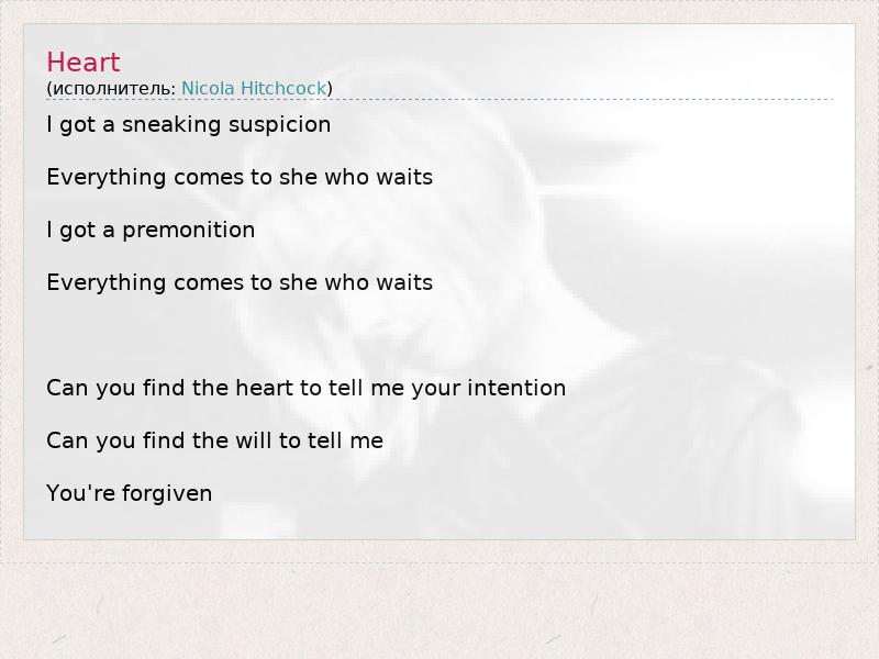 I got a sneaking suspicion Everything comes to she who waits I got a premonition Everything comes to she who waits Can you find the heart to tell me your intention Can you find the will to tell me You're forgiven