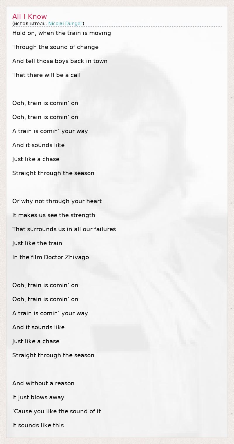Hold on, when the train is moving Through the sound of change And tell those boys back in town That there will be a call Ooh, train is comin' on Ooh, train is comin' on A train is comin' your way And it sounds like Just like a chase Straight through the season Or why not through your heart It makes us see the strength That surrounds us in all our failures Just like the train In the film Doctor Zhivago Ooh, train is comin' on Ooh, train is comin' on A train is comin' your way And it sounds like Just like a chase Straight through the season And without a reason It just blows away 'Cause you like the sound of it It sounds like this