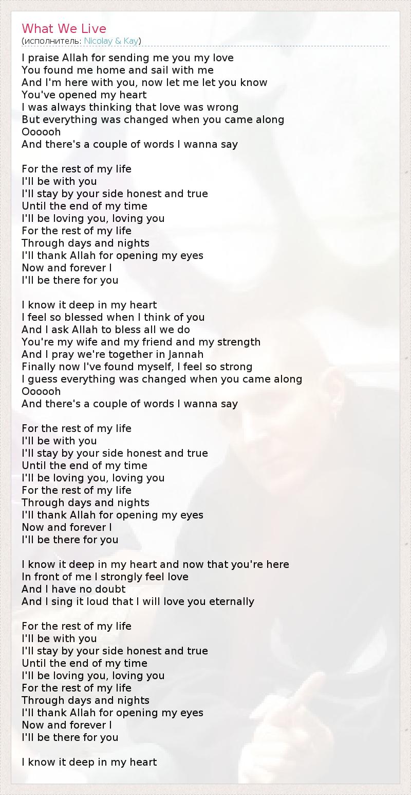 I praise Allah for sending me you my love You found me home and sail with me And I'm here with you, now let me let you know You've opened my heart I was always thinking that love was wrong But everything was changed when you came along Oooooh And there's a couple of words I wanna say For the rest of my life I'll be with you I'll stay by your side honest and true Until the end of my time I'll be loving you, loving you For the rest of my life Through days and nights I'll thank Allah for opening my eyes Now and forever I I'll be there for you I know it deep in my heart I feel so blessed when I think of you And I ask Allah to bless all we do You're my wife and my friend and my strength And I pray we're together in Jannah Finally now I've found myself, I feel so strong I guess everything was changed when you came along Oooooh And there's a couple of words I wanna say For the rest of my life I'll be with you I'll stay by your side honest and true Until the end of my time I'll be loving you, loving you For the rest of my life Through days and nights I'll thank Allah for opening my eyes Now and forever I I'll be there for you I know it deep in my heart and now that you're here In front of me I strongly feel love And I have no doubt And I sing it loud that I will love you eternally For the rest of my life I'll be with you I'll stay by your side honest and true Until the end of my time I'll be loving you, loving you For the rest of my life Through days and nights I'll thank Allah for opening my eyes Now and forever I I'll be there for you I know it deep in my heart