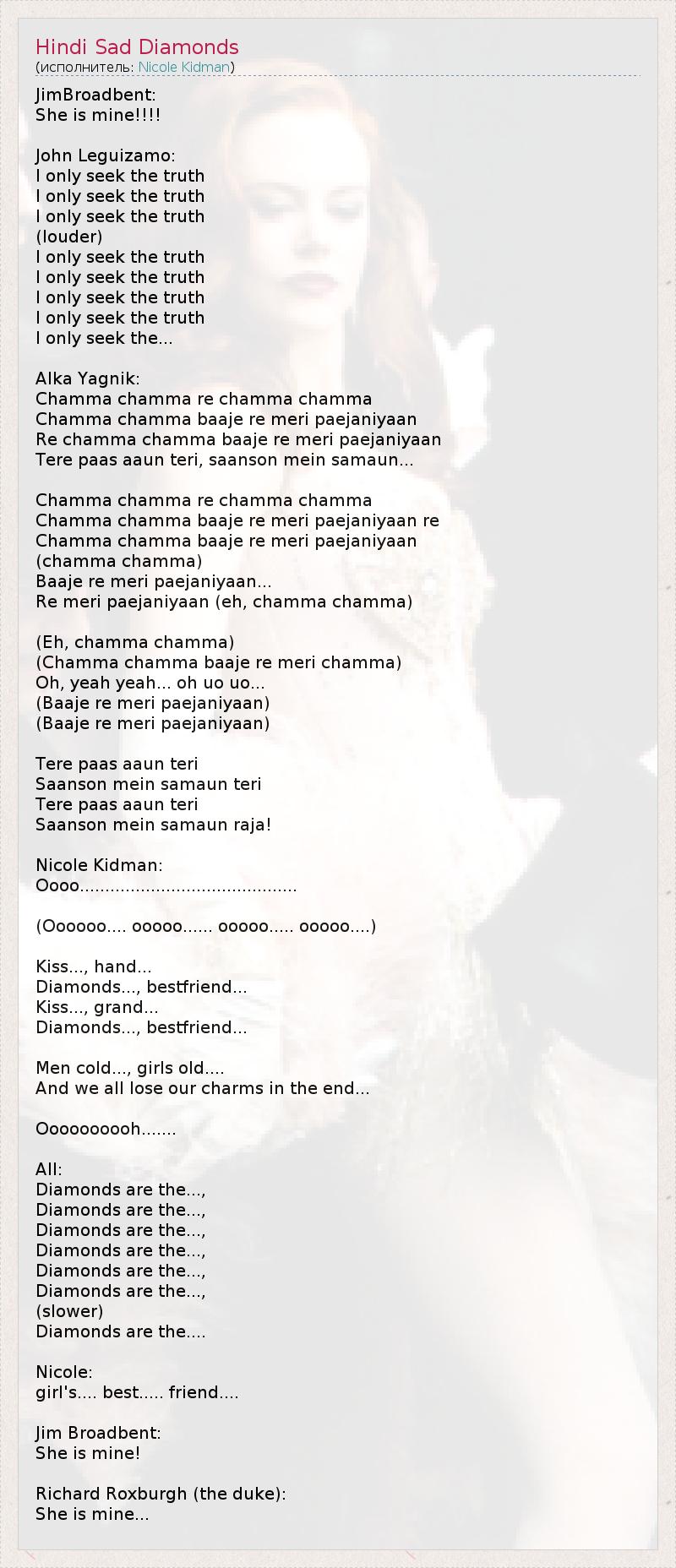 JimBroadbent: She is mine!!!! John Leguizamo: I only seek the truth I only seek the truth I only seek the truth (louder) I only seek the truth I only seek the truth I only seek the truth I only seek the truth I only seek the... Alka Yagnik: Chamma chamma re chamma chamma Chamma chamma baaje re meri paejaniyaan Re chamma chamma baaje re meri paejaniyaan Tere paas aaun teri, saanson mein samaun... Chamma chamma re chamma chamma Chamma chamma baaje re meri paejaniyaan re Chamma chamma baaje re meri paejaniyaan (chamma chamma) Baaje re meri paejaniyaan... Re meri paejaniyaan (eh, chamma chamma) (Eh, chamma chamma) (Chamma chamma baaje re meri chamma) Oh, yeah yeah... oh uo uo... (Baaje re meri paejaniyaan) (Baaje re meri paejaniyaan) Tere paas aaun teri Saanson mein samaun teri Tere paas aaun teri Saanson mein samaun raja! Nicole Kidman: Oooo........................................... (Oooooo.... ooooo...... ooooo..... ooooo....) Kiss..., hand... Diamonds..., bestfriend... Kiss..., grand... Diamonds..., bestfriend... Men cold..., girls old.... And we all lose our charms in the end... Oooooooooh....... All: Diamonds are the..., Diamonds are the..., Diamonds are the..., Diamonds are the..., Diamonds are the..., Diamonds are the..., (slower) Diamonds are the.... Nicole: girl's.... best..... friend.... Jim Broadbent: She is mine! Richard Roxburgh (the duke): She is mine...