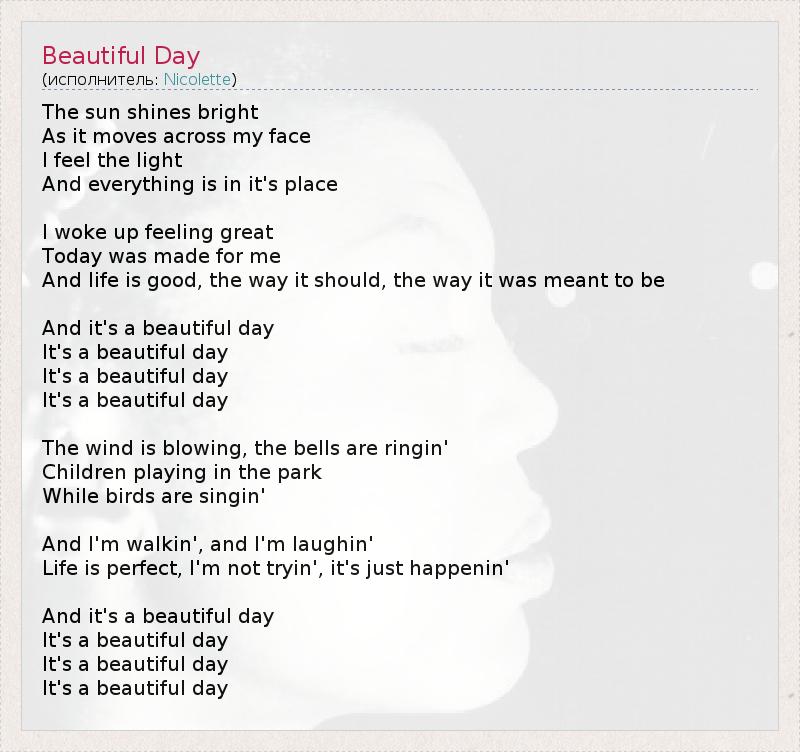 The sun shines bright As it moves across my face I feel the light And everything is in it's place I woke up feeling great Today was made for me And life is good, the way it should, the way it was meant to be And it's a beautiful day It's a beautiful day It's a beautiful day It's a beautiful day The wind is blowing, the bells are ringin' Children playing in the park While birds are singin' And I'm walkin', and I'm laughin' Life is perfect, I'm not tryin', it's just happenin' And it's a beautiful day It's a beautiful day It's a beautiful day It's a beautiful day