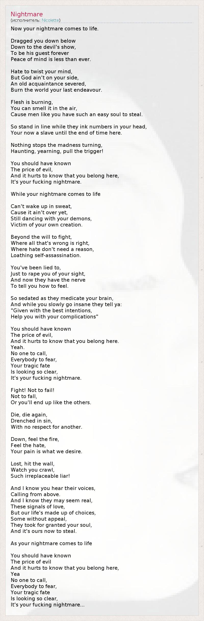 Now your nightmare comes to life. Dragged you down below Down to the devil's show, To be his guest forever Peace of mind is less than ever. Hate to twist your mind, But God ain't on your side, An old acquaintance severed, Burn the world your last endeavour. Flesh is burning, You can smell it in the air, Cause men like you have such an easy soul to steal. So stand in line while they ink numbers in your head, Your now a slave until the end of time here. Nothing stops the madness turning, Haunting, yearning, pull the trigger! You should have known The price of evil, And it hurts to know that you belong here, It's your fucking nightmare. While your nightmare comes to life Can't wake up in sweat, Cause it ain't over yet, Still dancing with your demons, Victim of your own creation. Beyond the will to fight, Where all that's wrong is right, Where hate don't need a reason, Loathing self-assassination. You've been lied to, Just to rape you of your sight, And now they have the nerve To tell you how to feel. So sedated as they medicate your brain, And while you slowly go insane they tell ya: "Given with the best intentions, Help you with your complications" You should have known The price of evil, And it hurts to know that you belong here. Yeah. No one to call, Everybody to fear, Your tragic fate Is looking so clear, It's your fucking nightmare. Fight! Not to fail! Not to fall, Or you'll end up like the others. Die, die again, Drenched in sin, With no respect for another. Down, feel the fire, Feel the hate, Your pain is what we desire. Lost, hit the wall, Watch you crawl, Such irreplaceable liar! And I know you hear their voices, Calling from above. And I know they may seem real, These signals of love, But our life's made up of choices, Some without appeal, They took for granted your soul, And it's ours now to steal. As your nightmare comes to life You should have known The price of evil And it hurts to know that you belong here, Yea No one to call, Everybody to fear, Your tragic fate Is looking so clear, It's your fucking nightmare...