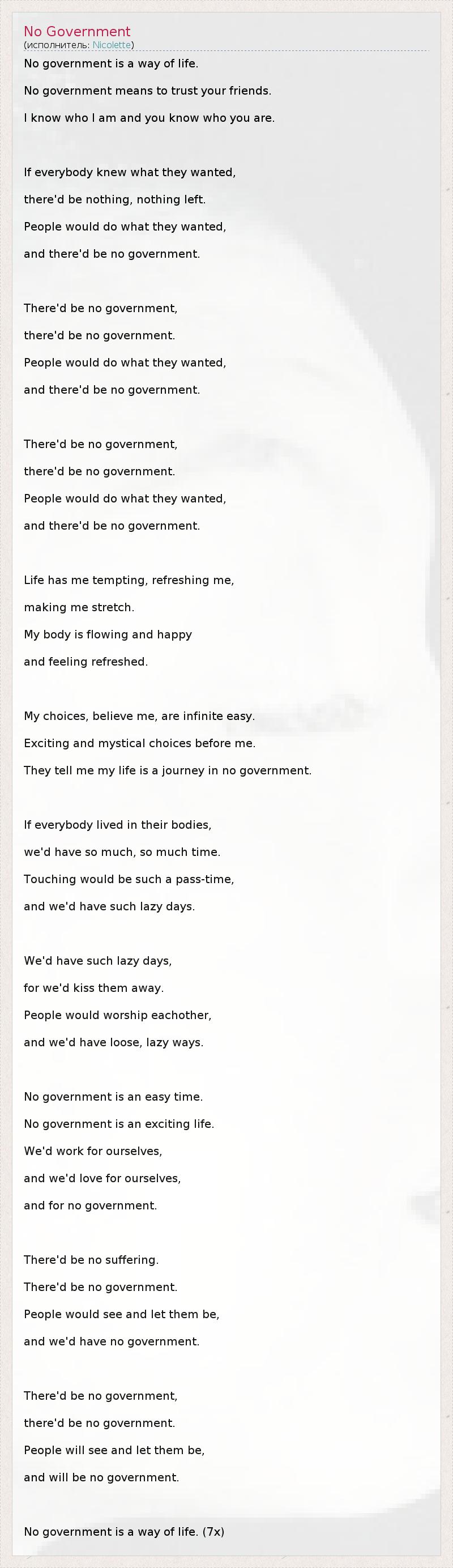 No government is a way of life. No government means to trust your friends. I know who I am and you know who you are. If everybody knew what they wanted, there'd be nothing, nothing left. People would do what they wanted, and there'd be no government. There'd be no government, there'd be no government. People would do what they wanted, and there'd be no government. There'd be no government, there'd be no government. People would do what they wanted, and there'd be no government. Life has me tempting, refreshing me, making me stretch. My body is flowing and happy and feeling refreshed. My choices, believe me, are infinite easy. Exciting and mystical choices before me. They tell me my life is a journey in no government. If everybody lived in their bodies, we'd have so much, so much time. Touching would be such a pass-time, and we'd have such lazy days. We'd have such lazy days, for we'd kiss them away. People would worship eachother, and we'd have loose, lazy ways. No government is an easy time. No government is an exciting life. We'd work for ourselves, and we'd love for ourselves, and for no government. There'd be no suffering. There'd be no government. People would see and let them be, and we'd have no government. There'd be no government, there'd be no government. People will see and let them be, and will be no government. No government is a way of life. (7x)