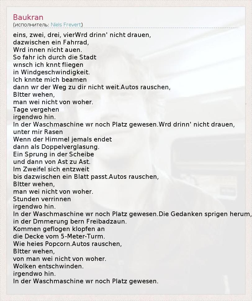 eins, zwei, drei, vierWrd drinn' nicht drauen, dazwischen ein Fahrrad, Wrd innen nicht auen. So fahr ich durch die Stadt wnsch ich knnt fliegen in Windgeschwindigkeit. Ich knnte mich beamen dann wr der Weg zu dir nicht weit.Autos rauschen, Bltter wehen, man wei nicht von woher. Tage vergehen irgendwo hin. In der Waschmaschine wr noch Platz gewesen.Wrd drinn' nicht drauen, unter mir Rasen Wenn der Himmel jemals endet dann als Doppelverglasung. Ein Sprung in der Scheibe und dann von Ast zu Ast. Im Zweifel sich entzweit bis dazwischen ein Blatt passt.Autos rauschen, Bltter wehen, man wei nicht von woher. Stunden verrinnen irgendwo hin. In der Waschmaschine wr noch Platz gewesen.Die Gedanken sprigen herum, in der Dmmerung bern Freibadzaun. Kommen geflogen klopfen an die Decke vom 5-Meter-Turm. Wie heies Popcorn.Autos rauschen, Bltter wehen, von man wei nicht von woher. Wolken entschwinden. irgendwo hin. In der Waschmaschine wr noch Platz gewesen.