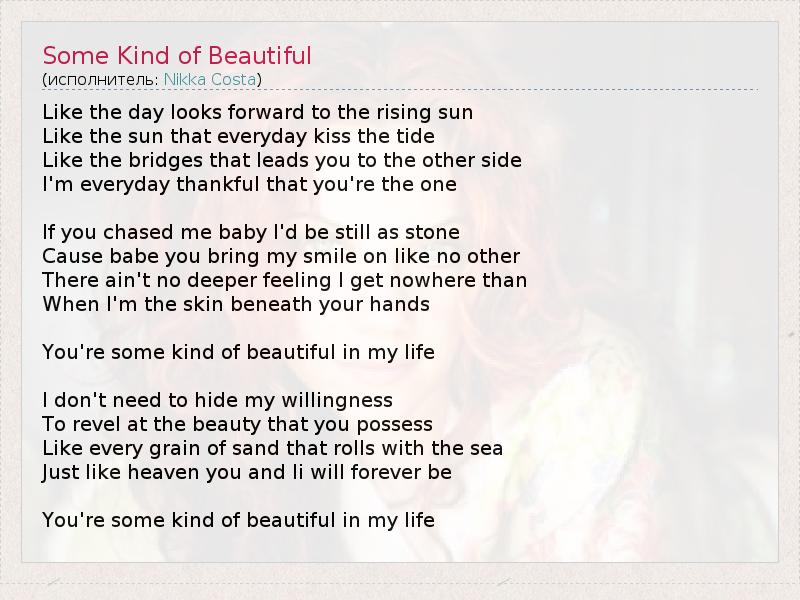 Like the day looks forward to the rising sun Like the sun that everyday kiss the tide Like the bridges that leads you to the other side I'm everyday thankful that you're the one If you chased me baby I'd be still as stone Cause babe you bring my smile on like no other There ain't no deeper feeling I get nowhere than When I'm the skin beneath your hands You're some kind of beautiful in my life I don't need to hide my willingness To revel at the beauty that you possess Like every grain of sand that rolls with the sea Just like heaven you and Ii will forever be You're some kind of beautiful in my life