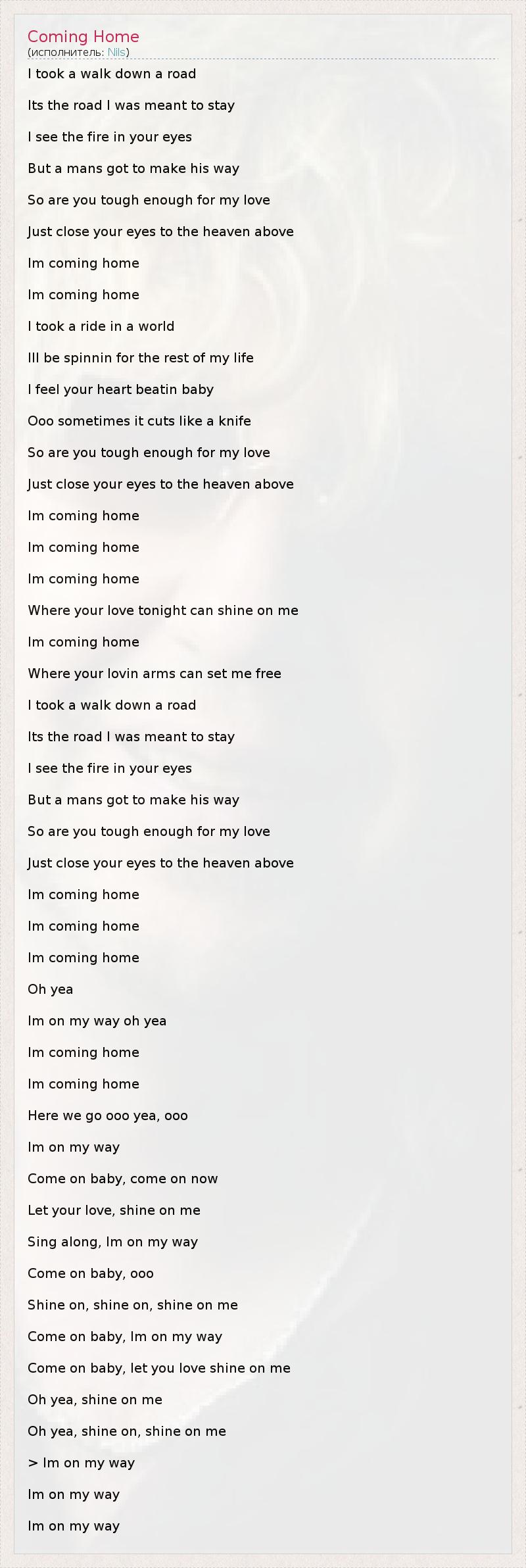 Я ушёл по дороге По той, по которой мне не надо было уходить Я вижу огонёк в твоих глазах Но каждый избирает свой путь. Но моя любовь выдержала проверку временем Просто закрой глаза и вверх голову подними – Я возвращаюсь домой Я возвращаюсь домой. Я достаточно наездился по миру Хватит на всю оставшуюся жизнь Я чувствую, как бьётся твоё сердце, крошка Мне так больно, словно нож воткнули в сердце. Но моя любовь выдержала проверку временем Просто закрой глаза и вверх голову подними Я возвращаюсь домой Я возвращаюсь домой Я возвращаюсь домой Туда, где твоя любовь освещает ночь. Я возвращаюсь домой Туда, где твои объятия освобождают. Я ушёл по дороге По той, по которой мне не надо было уходить Я вижу огонёк в твоих глазах. Но каждый избирает свой путь А моя любовь выдержала проверку временем Просто закрой глаза и вверх голову подними – Я возвращаюсь домой Я возвращаюсь домой Я возвращаюсь домой