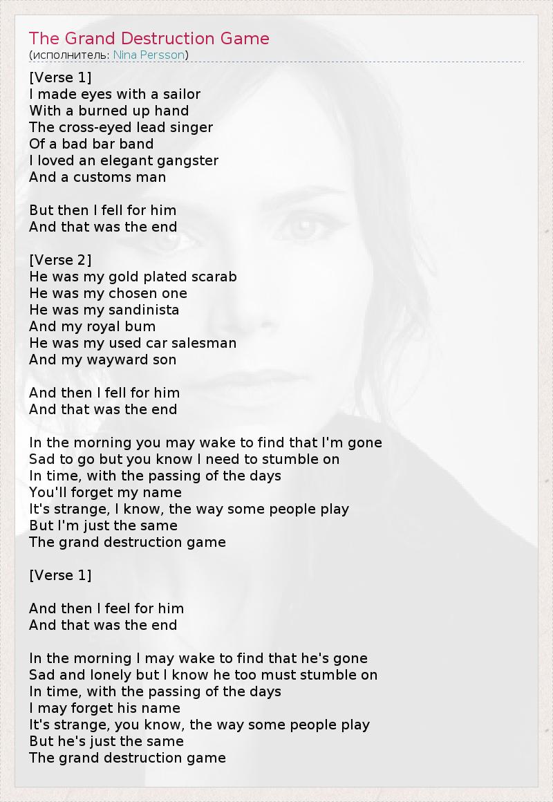 [Verse 1] I made eyes with a sailor With a burned up hand The cross-eyed lead singer Of a bad bar band I loved an elegant gangster And a customs man But then I fell for him And that was the end [Verse 2] He was my gold plated scarab He was my chosen one He was my sandinista And my royal bum He was my used car salesman And my wayward son And then I fell for him And that was the end In the morning you may wake to find that I'm gone Sad to go but you know I need to stumble on In time, with the passing of the days You'll forget my name It's strange, I know, the way some people play But I'm just the same The grand destruction game [Verse 1] And then I feel for him And that was the end In the morning I may wake to find that he's gone Sad and lonely but I know he too must stumble on In time, with the passing of the days I may forget his name It's strange, you know, the way some people play But he's just the same The grand destruction game