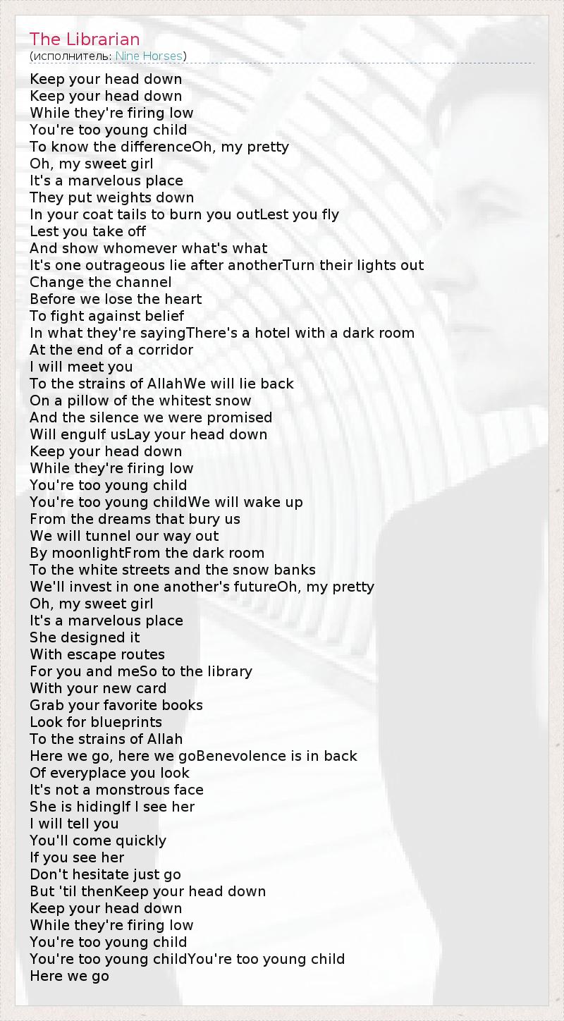 Это интересно:Nine Horses — музыкальный проект певца и инструменталиста Дэвида Силвиана, его брата — барабанщика Стива Янсена и музыканта, автора электронных композиций Бернта Фридмана.Коллектив выпустил первый альбом Snow Borne Sorrow в октябре 2005 года. В записи альбома приняли участие норвежский трубач Арве Хенриксен, шведская певица Стина Норденстам и японский композитор, клавишник Рюичи Сакамото... продолжение