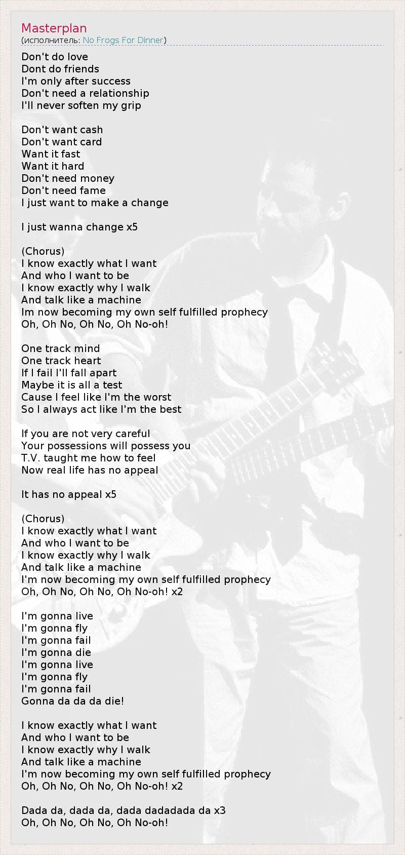 Don't do love Dont do friends I'm only after success Don't need a relationship I'll never soften my grip Don't want cash Don't want card Want it fast Want it hard Don't need money Don't need fame I just want to make a change I just wanna change x5 (Chorus) I know exactly what I want And who I want to be I know exactly why I walk And talk like a machine Im now becoming my own self fulfilled prophecy Oh, Oh No, Oh No, Oh No-oh! One track mind One track heart If I fail I'll fall apart Maybe it is all a test Cause I feel like I'm the worst So I always act like I'm the best If you are not very careful Your possessions will possess you T.V. taught me how to feel Now real life has no appeal It has no appeal x5 (Chorus) I know exactly what I want And who I want to be I know exactly why I walk And talk like a machine I'm now becoming my own self fulfilled prophecy Oh, Oh No, Oh No, Oh No-oh! x2 I'm gonna live I'm gonna fly I'm gonna fail I'm gonna die I'm gonna live I'm gonna fly I'm gonna fail Gonna da da da die! I know exactly what I want And who I want to be I know exactly why I walk And talk like a machine I'm now becoming my own self fulfilled prophecy Oh, Oh No, Oh No, Oh No-oh! x2 Dada da, dada da, dada dadadada da x3 Oh, Oh No, Oh No, Oh No-oh!