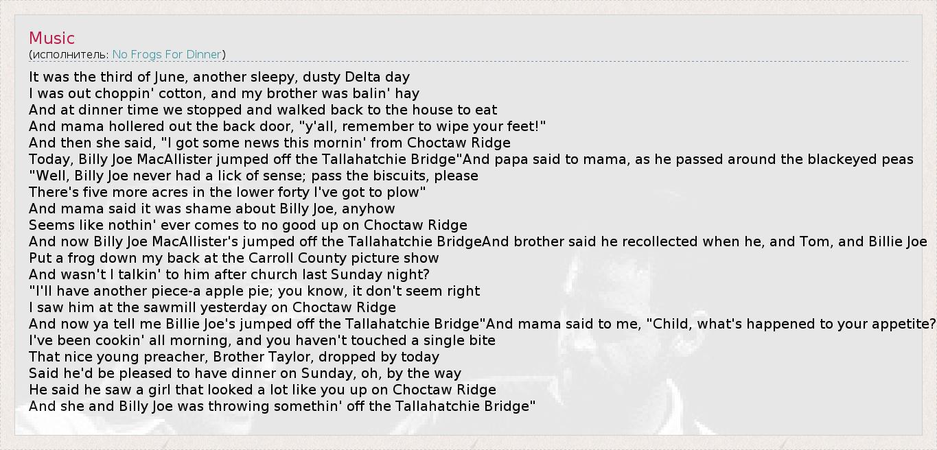 Today, Billy Joe MacAllister jumped off the Tallahatchie Bridge"And papa said to mama, as he passed around the blackeyed peas