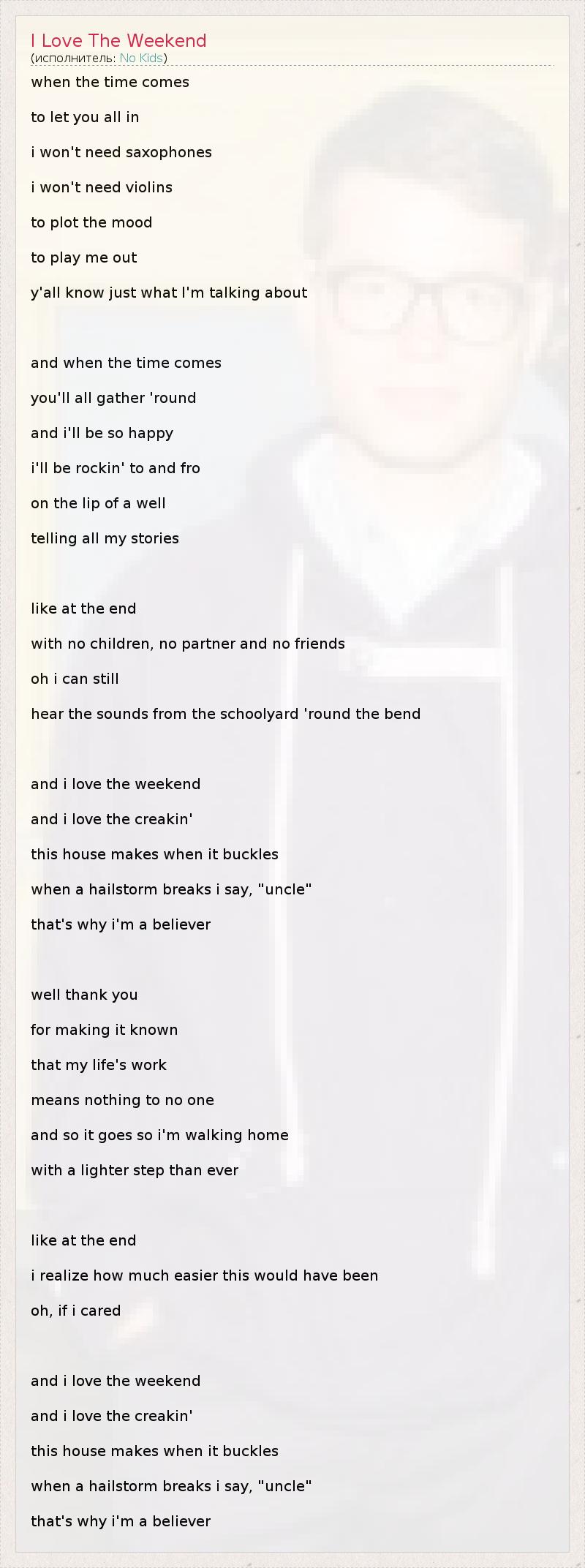 when the time comes to let you all in i won't need saxophones i won't need violins to plot the mood to play me out y'all know just what I'm talking about and when the time comes you'll all gather 'round and i'll be so happy i'll be rockin' to and fro on the lip of a well telling all my stories like at the end with no children, no partner and no friends oh i can still hear the sounds from the schoolyard 'round the bend and i love the weekend and i love the creakin' this house makes when it buckles when a hailstorm breaks i say, "uncle" that's why i'm a believer well thank you for making it known that my life's work means nothing to no one and so it goes so i'm walking home with a lighter step than ever like at the end i realize how much easier this would have been oh, if i cared and i love the weekend and i love the creakin' this house makes when it buckles when a hailstorm breaks i say, "uncle" that's why i'm a believer