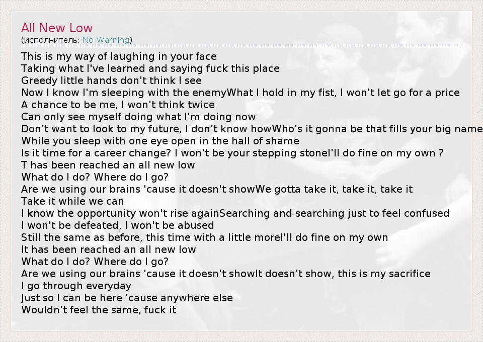 Это интересно:No Warning родом из Toronto, Canada.Группа была образована в 1998 под названием As We Once Were вокалистом Ben Cook и гитаристами Matt Delong и Jordan Posner.Они записали две дэмо записи и обе в '98 как As We Once Were.Группа впоследствии переименовала себя в No Warning.Их первый релиз под этим именем были три песни на демо-кассете.Они выпустили свою легендарную семёрку на Нью Йорковском лэйбле Martyr Records в 2001.В том же году Бостонский... продолжение