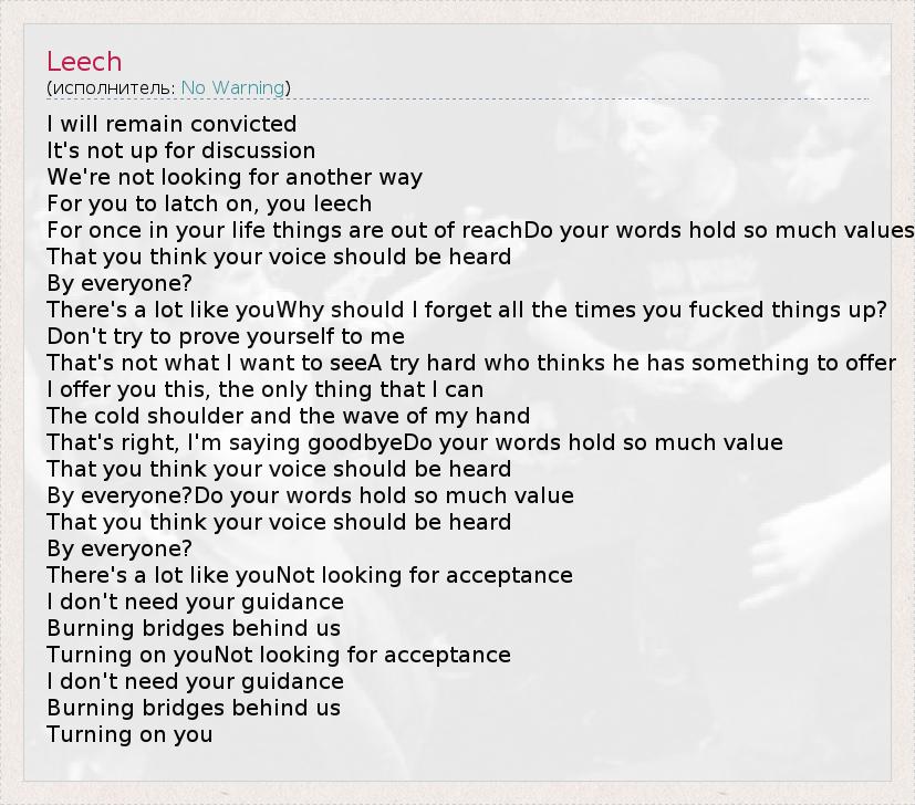I will remain convicted It's not up for discussion We're not looking for another way For you to latch on, you leech For once in your life things are out of reachDo your words hold so much values That you think your voice should be heard By everyone? There's a lot like youWhy should I forget all the times you fucked things up? Don't try to prove yourself to me That's not what I want to seeA try hard who thinks he has something to offer I offer you this, the only thing that I can The cold shoulder and the wave of my hand That's right, I'm saying goodbyeDo your words hold so much value That you think your voice should be heard By everyone?Do your words hold so much value That you think your voice should be heard By everyone? There's a lot like youNot looking for acceptance I don't need your guidance Burning bridges behind us Turning on youNot looking for acceptance I don't need your guidance Burning bridges behind us Turning on you