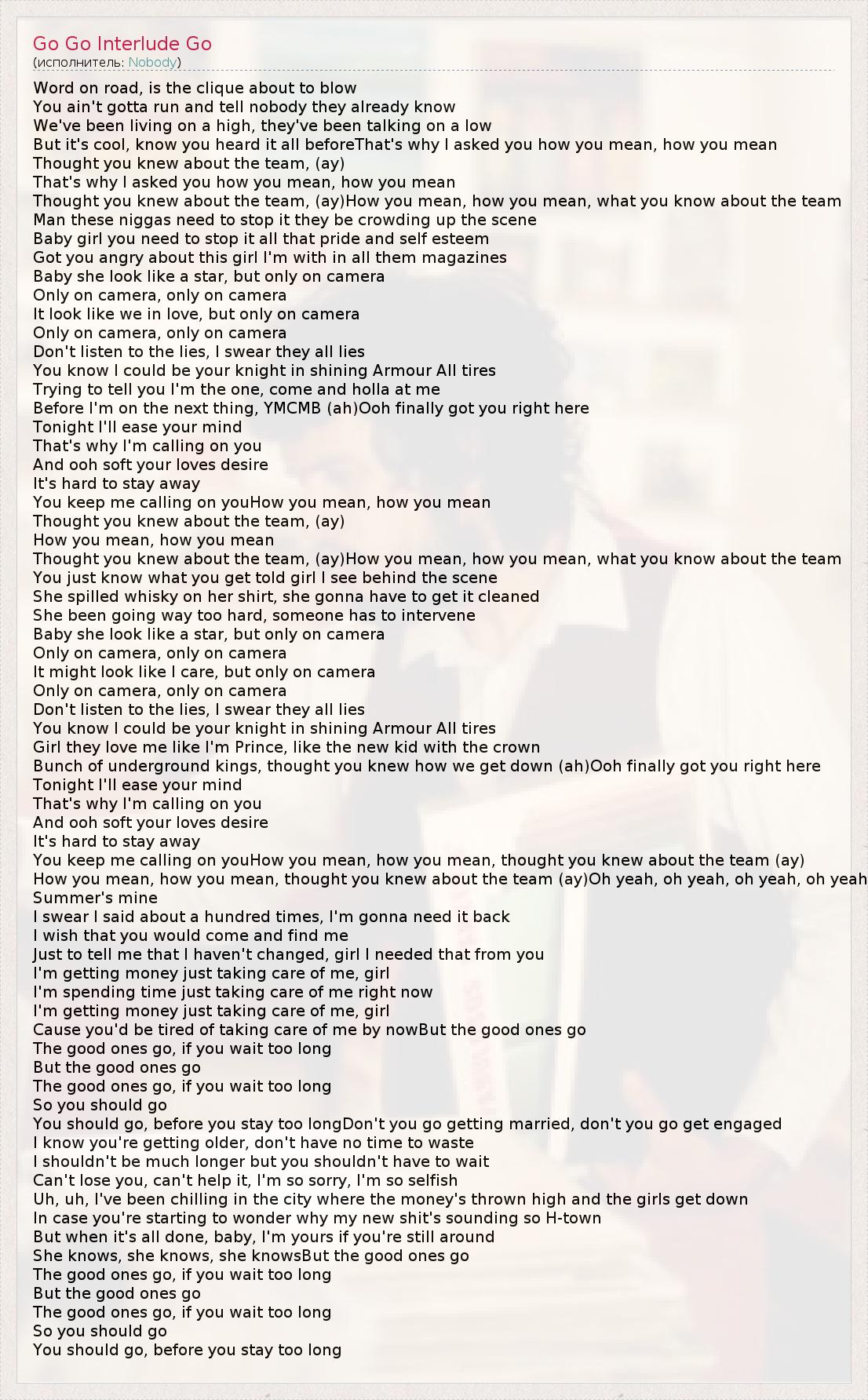 Word on road, is the clique about to blow You ain't gotta run and tell nobody they already know We've been living on a high, they've been talking on a low But it's cool, know you heard it all beforeThat's why I asked you how you mean, how you mean Thought you knew about the team, (ay) That's why I asked you how you mean, how you mean Thought you knew about the team, (ay)How you mean, how you mean, what you know about the team Man these niggas need to stop it they be crowding up the scene Baby girl you need to stop it all that pride and self esteem Got you angry about this girl I'm with in all them magazines Baby she look like a star, but only on camera Only on camera, only on camera It look like we in love, but only on camera Only on camera, only on camera Don't listen to the lies, I swear they all lies You know I could be your knight in shining Armour All tires Trying to tell you I'm the one, come and holla at me Before I'm on the next thing, YMCMB (ah)Ooh finally got you right here Tonight I'll ease your mind That's why I'm calling on you And ooh soft your loves desire It's hard to stay away You keep me calling on youHow you mean, how you mean Thought you knew about the team, (ay) How you mean, how you mean Thought you knew about the team, (ay)How you mean, how you mean, what you know about the team You just know what you get told girl I see behind the scene She spilled whisky on her shirt, she gonna have to get it cleaned She been going way too hard, someone has to intervene Baby she look like a star, but only on camera Only on camera, only on camera It might look like I care, but only on camera Only on camera, only on camera Don't listen to the lies, I swear they all lies You know I could be your knight in shining Armour All tires Girl they love me like I'm Prince, like the new kid with the crown Bunch of underground kings, thought you knew how we get down (ah)Ooh finally got you right here Tonight I'll ease your mind That's why I'm calling on you And ooh soft your loves desire It's hard to stay away You keep me calling on youHow you mean, how you mean, thought you knew about the team (ay) How you mean, how you mean, thought you knew about the team (ay)Oh yeah, oh yeah, oh yeah, oh yeah Summer's mine I swear I said about a hundred times, I'm gonna need it back I wish that you would come and find me Just to tell me that I haven't changed, girl I needed that from you I'm getting money just taking care of me, girl I'm spending time just taking care of me right now I'm getting money just taking care of me, girl Cause you'd be tired of taking care of me by nowBut the good ones go The good ones go, if you wait too long But the good ones go The good ones go, if you wait too long So you should go You should go, before you stay too longDon't you go getting married, don't you go get engaged I know you're getting older, don't have no time to waste I shouldn't be much longer but you shouldn't have to wait Can't lose you, can't help it, I'm so sorry, I'm so selfish Uh, uh, I've been chilling in the city where the money's thrown high and the girls get down In case you're starting to wonder why my new shit's sounding so H-town But when it's all done, baby, I'm yours if you're still around She knows, she knows, she knowsBut the good ones go The good ones go, if you wait too long But the good ones go The good ones go, if you wait too long So you should go You should go, before you stay too long