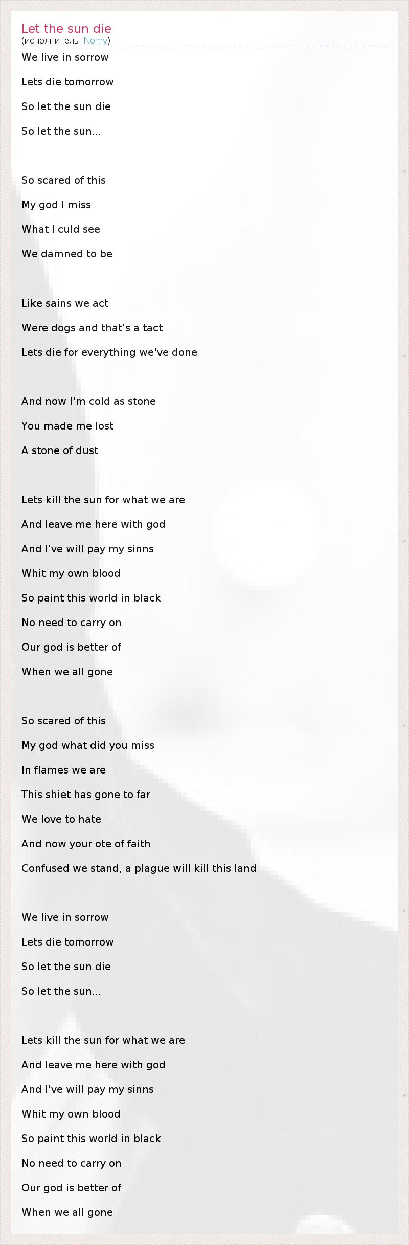 We live in sorrow Lets die tomorrow So let the sun die So let the sun... So scared of this My god I miss What I culd see We damned to be Like sains we act Were dogs and that's a tact Lets die for everything we've done And now I'm cold as stone You made me lost A stone of dust Lets kill the sun for what we are And leave me here with god And I've will pay my sinns Whit my own blood So paint this world in black No need to carry on Our god is better of When we all gone So scared of this My god what did you miss In flames we are This shiet has gone to far We love to hate And now your ote of faith Confused we stand, a plague will kill this land We live in sorrow Lets die tomorrow So let the sun die So let the sun... Lets kill the sun for what we are And leave me here with god And I've will pay my sinns Whit my own blood So paint this world in black No need to carry on Our god is better of When we all gone