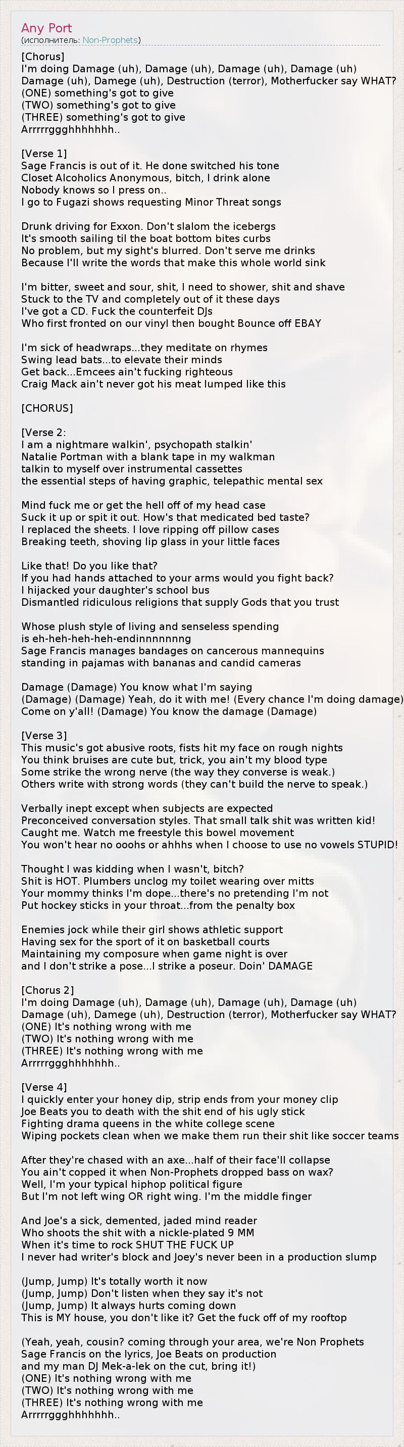 [Chorus] I'm doing Damage (uh), Damage (uh), Damage (uh), Damage (uh) Damage (uh), Damege (uh), Destruction (terror), Motherfucker say WHAT? (ONE) something's got to give (TWO) something's got to give (THREE) something's got to give Arrrrrggghhhhhhh.. [Verse 1] Sage Francis is out of it. He done switched his tone Closet Alcoholics Anonymous, bitch, I drink alone Nobody knows so I press on.. I go to Fugazi shows requesting Minor Threat songs Drunk driving for Exxon. Don't slalom the icebergs It's smooth sailing til the boat bottom bites curbs No problem, but my sight's blurred. Don't serve me drinks Because I'll write the words that make this whole world sink I'm bitter, sweet and sour, shit, I need to shower, shit and shave Stuck to the TV and completely out of it these days I've got a CD. Fuck the counterfeit DJs Who first fronted on our vinyl then bought Bounce off EBAY I'm sick of headwraps...they meditate on rhymes Swing lead bats...to elevate their minds Get back...Emcees ain't fucking righteous Craig Mack ain't never got his meat lumped like this [CHORUS] [Verse 2: I am a nightmare walkin', psychopath stalkin' Natalie Portman with a blank tape in my walkman talkin to myself over instrumental cassettes the essential steps of having graphic, telepathic mental sex Mind fuck me or get the hell off of my head case Suck it up or spit it out. How's that medicated bed taste? I replaced the sheets. I love ripping off pillow cases Breaking teeth, shoving lip glass in your little faces Like that! Do you like that? If you had hands attached to your arms would you fight back? I hijacked your daughter's school bus Dismantled ridiculous religions that supply Gods that you trust Whose plush style of living and senseless spending is eh-heh-heh-heh-endinnnnnnng Sage Francis manages bandages on cancerous mannequins standing in pajamas with bananas and candid cameras Damage (Damage) You know what I'm saying (Damage) (Damage) Yeah, do it with me! (Every chance I'm doing damage) Come on y'all! (Damage) You know the damage (Damage) [Verse 3] This music's got abusive roots, fists hit my face on rough nights You think bruises are cute but, trick, you ain't my blood type Some strike the wrong nerve (the way they converse is weak.) Others write with strong words (they can't build the nerve to speak.) Verbally inept except when subjects are expected Preconceived conversation styles. That small talk shit was written kid! Caught me. Watch me freestyle this bowel movement You won't hear no ooohs or ahhhs when I choose to use no vowels STUPID! Thought I was kidding when I wasn't, bitch? Shit is HOT. Plumbers unclog my toilet wearing over mitts Your mommy thinks I'm dope...there's no pretending I'm not Put hockey sticks in your throat...from the penalty box Enemies jock while their girl shows athletic support Having sex for the sport of it on basketball courts Maintaining my composure when game night is over and I don't strike a pose...I strike a poseur. Doin' DAMAGE [Chorus 2] I'm doing Damage (uh), Damage (uh), Damage (uh), Damage (uh) Damage (uh), Damege (uh), Destruction (terror), Motherfucker say WHAT? (ONE) It's nothing wrong with me (TWO) It's nothing wrong with me (THREE) It's nothing wrong with me Arrrrrggghhhhhhh.. [Verse 4] I quickly enter your honey dip, strip ends from your money clip Joe Beats you to death with the shit end of his ugly stick Fighting drama queens in the white college scene Wiping pockets clean when we make them run their shit like soccer teams After they're chased with an axe...half of their face'll collapse You ain't copped it when Non-Prophets dropped bass on wax? Well, I'm your typical hiphop political figure But I'm not left wing OR right wing. I'm the middle finger And Joe's a sick, demented, jaded mind reader Who shoots the shit with a nickle-plated 9 MM When it's time to rock SHUT THE FUCK UP I never had writer's block and Joey's never been in a production slump (Jump, Jump) It's totally worth it now (Jump, Jump) Don't listen when they say it's not (Jump, Jump) It always hurts coming down This is MY house, you don't like it? Get the fuck off of my rooftop (Yeah, yeah, cousin? coming through your area, we're Non Prophets Sage Francis on the lyrics, Joe Beats on production and my man DJ Mek-a-lek on the cut, bring it!) (ONE) It's nothing wrong with me (TWO) It's nothing wrong with me (THREE) It's nothing wrong with me Arrrrrggghhhhhhh..