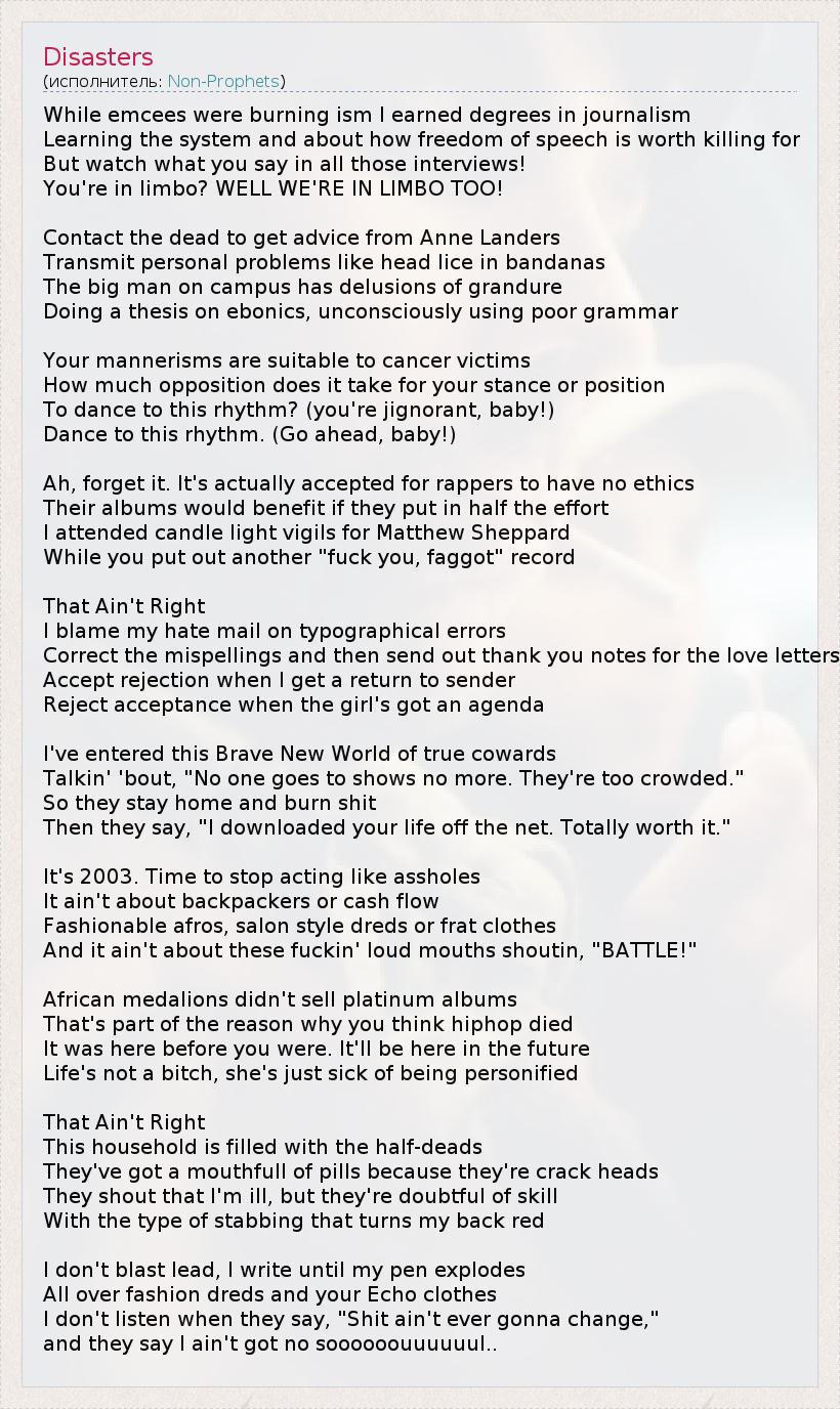 While emcees were burning ism I earned degrees in journalism Learning the system and about how freedom of speech is worth killing for But watch what you say in all those interviews! You're in limbo? WELL WE'RE IN LIMBO TOO! Contact the dead to get advice from Anne Landers Transmit personal problems like head lice in bandanas The big man on campus has delusions of grandure Doing a thesis on ebonics, unconsciously using poor grammar Your mannerisms are suitable to cancer victims How much opposition does it take for your stance or position To dance to this rhythm? (you're jignorant, baby!) Dance to this rhythm. (Go ahead, baby!) Ah, forget it. It's actually accepted for rappers to have no ethics Their albums would benefit if they put in half the effort I attended candle light vigils for Matthew Sheppard While you put out another "fuck you, faggot" record That Ain't Right I blame my hate mail on typographical errors Correct the mispellings and then send out thank you notes for the love letters Accept rejection when I get a return to sender Reject acceptance when the girl's got an agenda I've entered this Brave New World of true cowards Talkin' 'bout, "No one goes to shows no more. They're too crowded." So they stay home and burn shit Then they say, "I downloaded your life off the net. Totally worth it." It's 2003. Time to stop acting like assholes It ain't about backpackers or cash flow Fashionable afros, salon style dreds or frat clothes And it ain't about these fuckin' loud mouths shoutin, "BATTLE!" African medalions didn't sell platinum albums That's part of the reason why you think hiphop died It was here before you were. It'll be here in the future Life's not a bitch, she's just sick of being personified That Ain't Right This household is filled with the half-deads They've got a mouthfull of pills because they're crack heads They shout that I'm ill, but they're doubtful of skill With the type of stabbing that turns my back red I don't blast lead, I write until my pen explodes All over fashion dreds and your Echo clothes I don't listen when they say, "Shit ain't ever gonna change," and they say I ain't got no soooooouuuuuul..