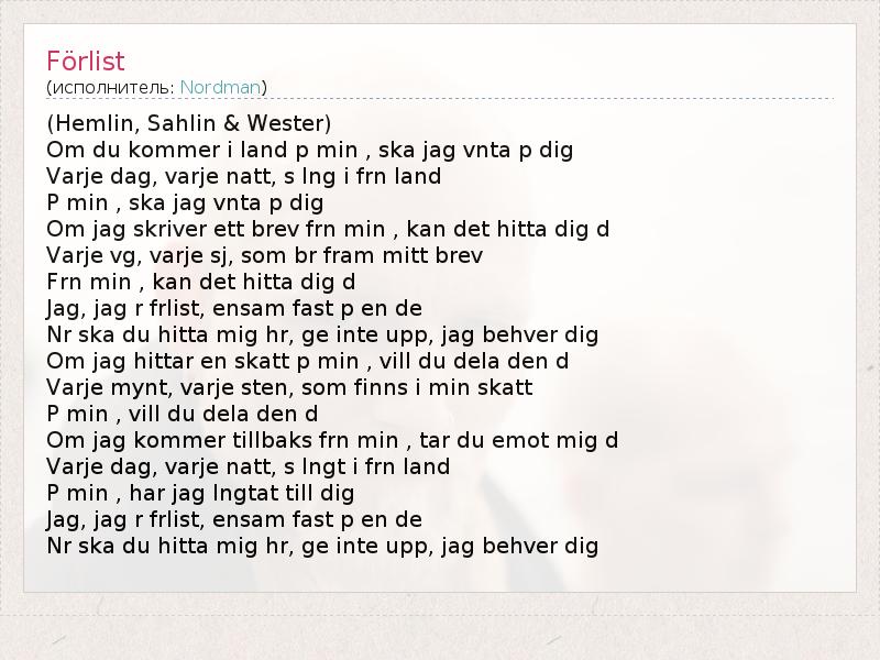 Это интересно:Nordman шведская группа, основанная в 1993 году. Стиль смешивает в себе народную, рок и поп музыку. Этот жанр называется etnorock или folkrock на шведском языке.Группу составляют Håkan Hemlin, как певец и лидер группы, и Mats Wester, который играет на никельхарпе.Хитами группы были Förlist ("Кораблекрушение") и Vandraren ("Странник"). Группа распалась в 1998 из-за... продолжение