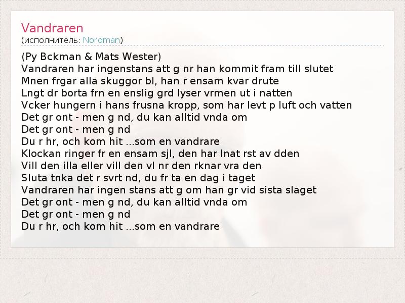 Это интересно:Nordman шведская группа, основанная в 1993 году. Стиль смешивает в себе народную, рок и поп музыку. Этот жанр называется etnorock или folkrock на шведском языке.Группу составляют Håkan Hemlin, как певец и лидер группы, и Mats Wester, который играет на никельхарпе.Хитами группы были Förlist ("Кораблекрушение") и Vandraren ("Странник"). Группа распалась в 1998 из-за... продолжение