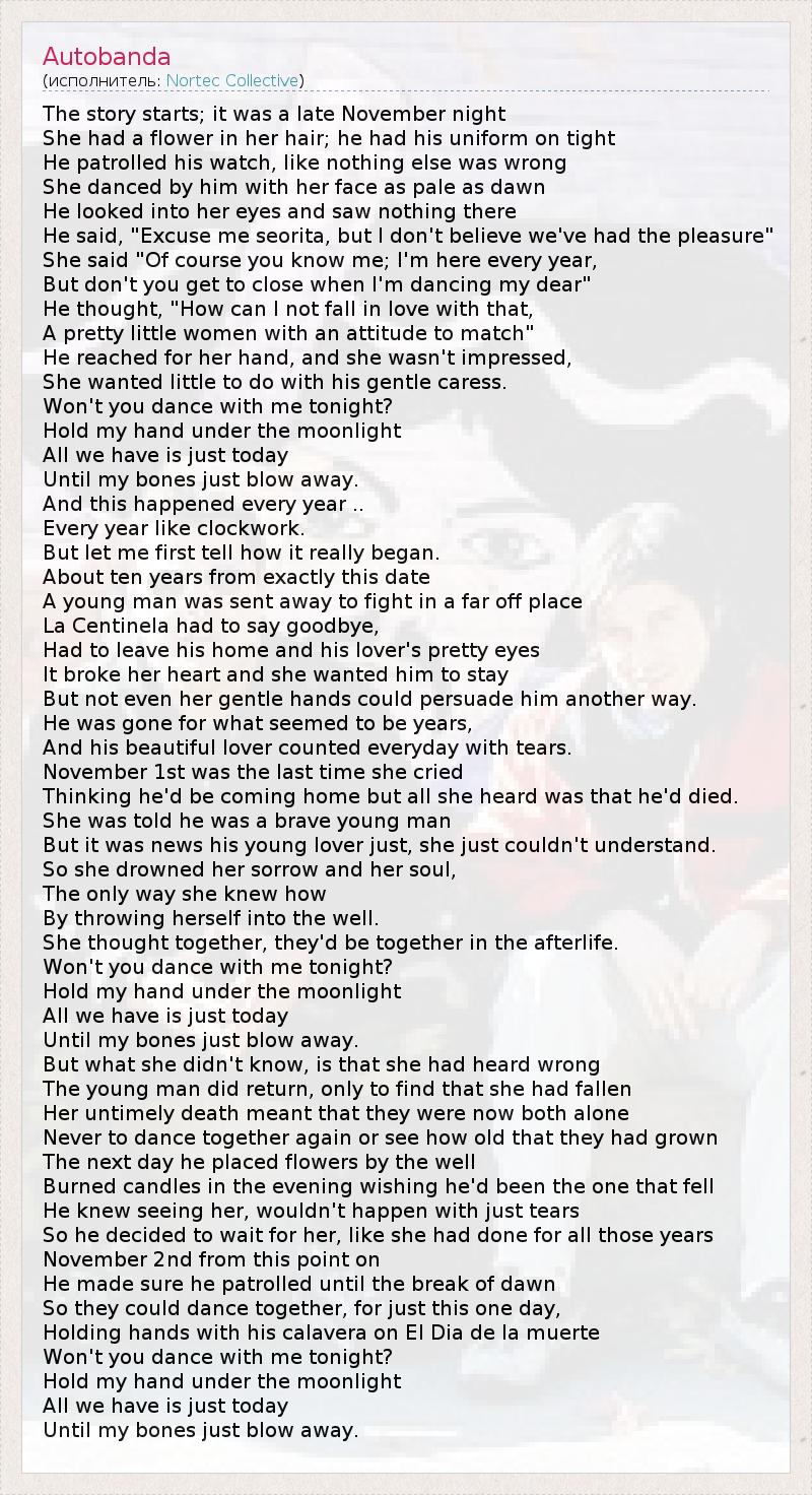 The story starts; it was a late November night She had a flower in her hair; he had his uniform on tight He patrolled his watch, like nothing else was wrong She danced by him with her face as pale as dawn He looked into her eyes and saw nothing there He said, "Excuse me seorita, but I don't believe we've had the pleasure" She said "Of course you know me; I'm here every year, But don't you get to close when I'm dancing my dear" He thought, "How can I not fall in love with that, A pretty little women with an attitude to match" He reached for her hand, and she wasn't impressed, She wanted little to do with his gentle caress. Won't you dance with me tonight? Hold my hand under the moonlight All we have is just today Until my bones just blow away. And this happened every year .. Every year like clockwork. But let me first tell how it really began. About ten years from exactly this date A young man was sent away to fight in a far off place La Centinela had to say goodbye, Had to leave his home and his lover's pretty eyes It broke her heart and she wanted him to stay But not even her gentle hands could persuade him another way. He was gone for what seemed to be years, And his beautiful lover counted everyday with tears. November 1st was the last time she cried Thinking he'd be coming home but all she heard was that he'd died. She was told he was a brave young man But it was news his young lover just, she just couldn't understand. So she drowned her sorrow and her soul, The only way she knew how By throwing herself into the well. She thought together, they'd be together in the afterlife. Won't you dance with me tonight? Hold my hand under the moonlight All we have is just today Until my bones just blow away. But what she didn't know, is that she had heard wrong The young man did return, only to find that she had fallen Her untimely death meant that they were now both alone Never to dance together again or see how old that they had grown The next day he placed flowers by the well Burned candles in the evening wishing he'd been the one that fell He knew seeing her, wouldn't happen with just tears So he decided to wait for her, like she had done for all those years November 2nd from this point on He made sure he patrolled until the break of dawn So they could dance together, for just this one day, Holding hands with his calavera on El Dia de la muerte Won't you dance with me tonight? Hold my hand under the moonlight All we have is just today Until my bones just blow away.