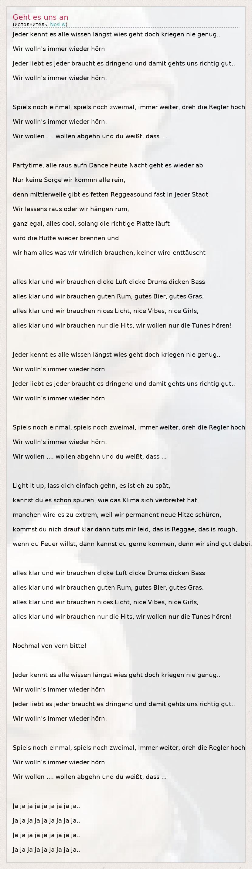 Jeder kennt es alle wissen längst wies geht doch kriegen nie genug.. Wir wolln's immer wieder hörn Jeder liebt es jeder braucht es dringend und damit gehts uns richtig gut.. Wir wolln's immer wieder hörn. Spiels noch einmal, spiels noch zweimal, immer weiter, dreh die Regler hoch Wir wolln's immer wieder hörn. Wir wollen .... wollen abgehn und du weißt, dass ... Partytime, alle raus aufn Dance heute Nacht geht es wieder ab Nur keine Sorge wir kommn alle rein, denn mittlerweile gibt es fetten Reggeasound fast in jeder Stadt Wir lassens raus oder wir hängen rum, ganz egal, alles cool, solang die richtige Platte läuft wird die Hütte wieder brennen und wir ham alles was wir wirklich brauchen, keiner wird enttäuscht alles klar und wir brauchen dicke Luft dicke Drums dicken Bass alles klar und wir brauchen guten Rum, gutes Bier, gutes Gras. alles klar und wir brauchen nices Licht, nice Vibes, nice Girls, alles klar und wir brauchen nur die Hits, wir wollen nur die Tunes hören! Jeder kennt es alle wissen längst wies geht doch kriegen nie genug.. Wir wolln's immer wieder hörn Jeder liebt es jeder braucht es dringend und damit gehts uns richtig gut.. Wir wolln's immer wieder hörn. Spiels noch einmal, spiels noch zweimal, immer weiter, dreh die Regler hoch Wir wolln's immer wieder hörn. Wir wollen .... wollen abgehn und du weißt, dass ... Light it up, lass dich einfach gehn, es ist eh zu spät, kannst du es schon spüren, wie das Klima sich verbreitet hat, manchen wird es zu extrem, weil wir permanent neue Hitze schüren, kommst du nich drauf klar dann tuts mir leid, das is Reggae, das is rough, wenn du Feuer willst, dann kannst du gerne kommen, denn wir sind gut dabei. alles klar und wir brauchen dicke Luft dicke Drums dicken Bass alles klar und wir brauchen guten Rum, gutes Bier, gutes Gras. alles klar und wir brauchen nices Licht, nice Vibes, nice Girls, alles klar und wir brauchen nur die Hits, wir wollen nur die Tunes hören! Nochmal von vorn bitte! Jeder kennt es alle wissen längst wies geht doch kriegen nie genug.. Wir wolln's immer wieder hörn Jeder liebt es jeder braucht es dringend und damit gehts uns richtig gut.. Wir wolln's immer wieder hörn. Spiels noch einmal, spiels noch zweimal, immer weiter, dreh die Regler hoch Wir wolln's immer wieder hörn. Wir wollen .... wollen abgehn und du weißt, dass ... Ja ja ja ja ja ja ja ja ja.. Ja ja ja ja ja ja ja ja ja.. Ja ja ja ja ja ja ja ja ja.. Ja ja ja ja ja ja ja ja ja..
