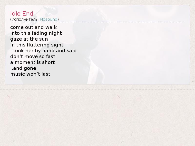 come out and walk into this fading night gaze at the sun in this fluttering sight I took her by hand and said don't move so fast a moment is short ..and gone music won't last