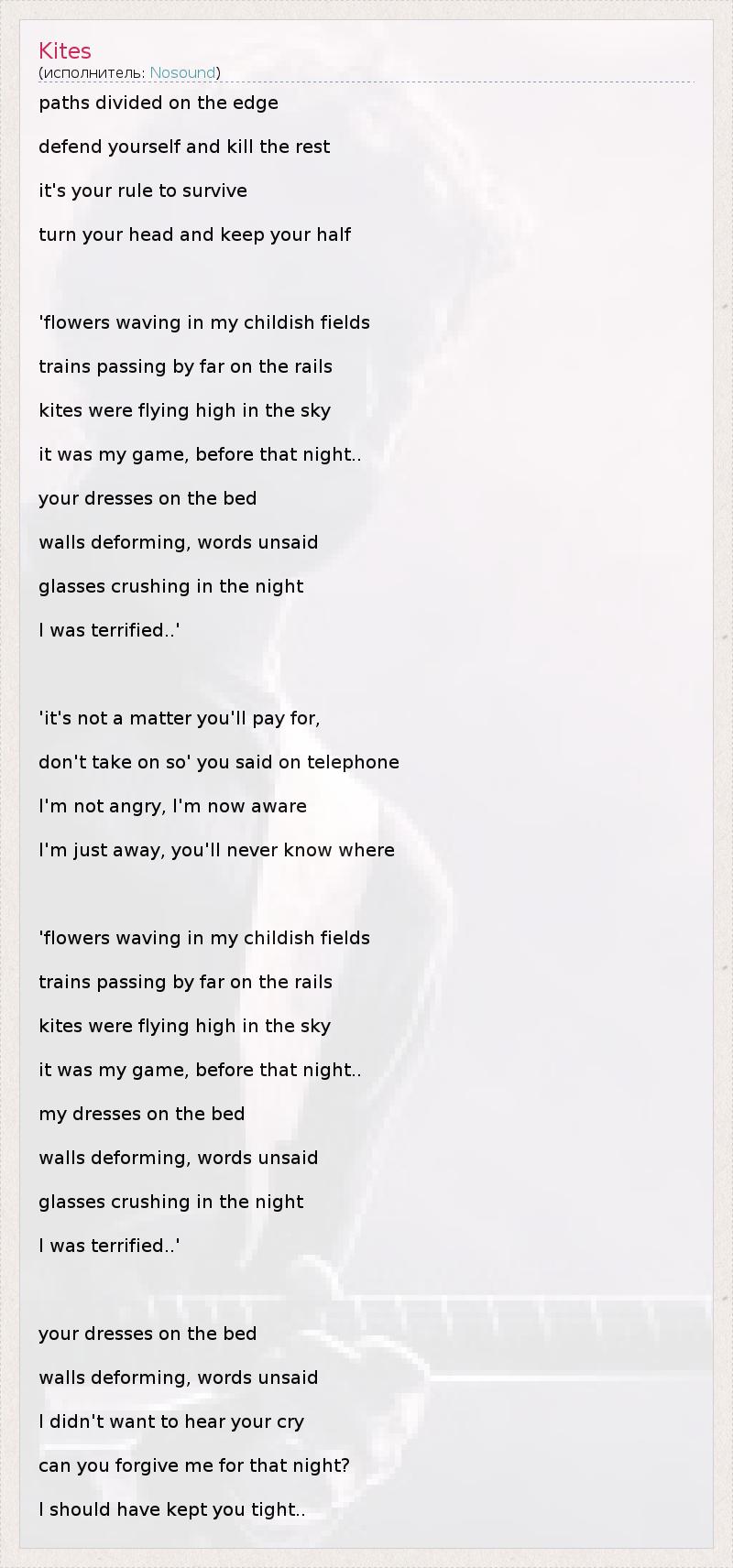 paths divided on the edge defend yourself and kill the rest it's your rule to survive turn your head and keep your half 'flowers waving in my childish fields trains passing by far on the rails kites were flying high in the sky it was my game, before that night.. your dresses on the bed walls deforming, words unsaid glasses crushing in the night I was terrified..' 'it's not a matter you'll pay for, don't take on so' you said on telephone I'm not angry, I'm now aware I'm just away, you'll never know where 'flowers waving in my childish fields trains passing by far on the rails kites were flying high in the sky it was my game, before that night.. my dresses on the bed walls deforming, words unsaid glasses crushing in the night I was terrified..' your dresses on the bed walls deforming, words unsaid I didn't want to hear your cry can you forgive me for that night? I should have kept you tight..