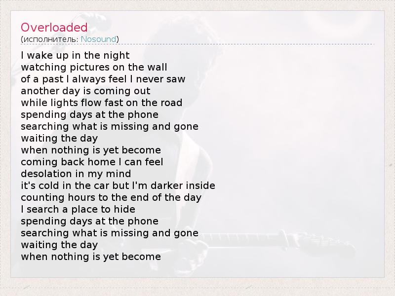 I wake up in the night watching pictures on the wall of a past I always feel I never saw another day is coming out while lights flow fast on the road spending days at the phone searching what is missing and gone waiting the day when nothing is yet become coming back home I can feel desolation in my mind it's cold in the car but I'm darker inside counting hours to the end of the day I search a place to hide spending days at the phone searching what is missing and gone waiting the day when nothing is yet become