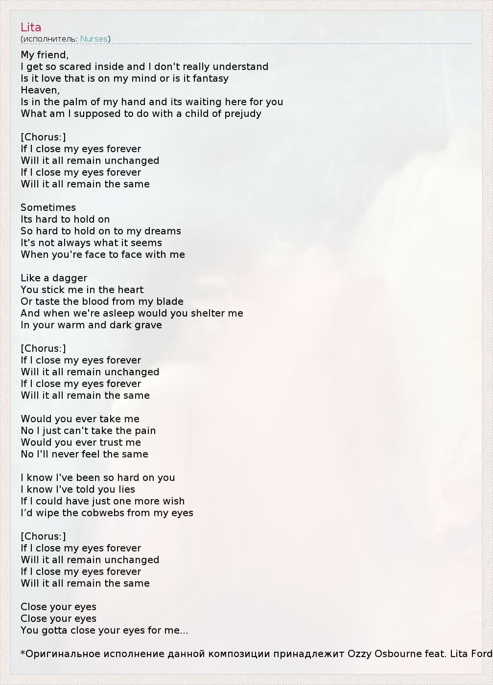 My friend, I get so scared inside and I don't really understand Is it love that is on my mind or is it fantasy Heaven, Is in the palm of my hand and its waiting here for you What am I supposed to do with a child of prejudy [Chorus:] If I close my eyes forever Will it all remain unchanged If I close my eyes forever Will it all remain the same Sometimes Its hard to hold on So hard to hold on to my dreams It's not always what it seems When you're face to face with me Like a dagger You stick me in the heart Or taste the blood from my blade And when we're asleep would you shelter me In your warm and dark grave [Chorus:] If I close my eyes forever Will it all remain unchanged If I close my eyes forever Will it all remain the same Would you ever take me No I just can't take the pain Would you ever trust me No I'll never feel the same I know I've been so hard on you I know I've told you lies If I could have just one more wish I’d wipe the cobwebs from my eyes [Chorus:] If I close my eyes forever Will it all remain unchanged If I close my eyes forever Will it all remain the same Close your eyes Close your eyes You gotta close your eyes for me... *Оригинальное исполнение данной композиции принадлежит Ozzy Osbourne feat. Lita Ford