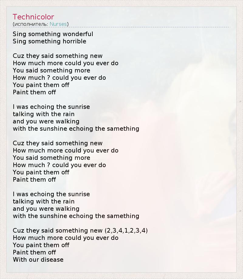 Sing something wonderful Sing something horrible Cuz they said something new How much more could you ever do You said something more How much ? could you ever do You paint them off Paint them off I was echoing the sunrise talking with the rain and you were walking with the sunshine echoing the samething Cuz they said something new How much more could you ever do You said something more How much ? could you ever do You paint them off Paint them off I was echoing the sunrise talking with the rain and you were walking with the sunshine echoing the samething Cuz they said something new (2,3,4,1,2,3,4) How much more could you ever do You paint them off Paint them off With our disease