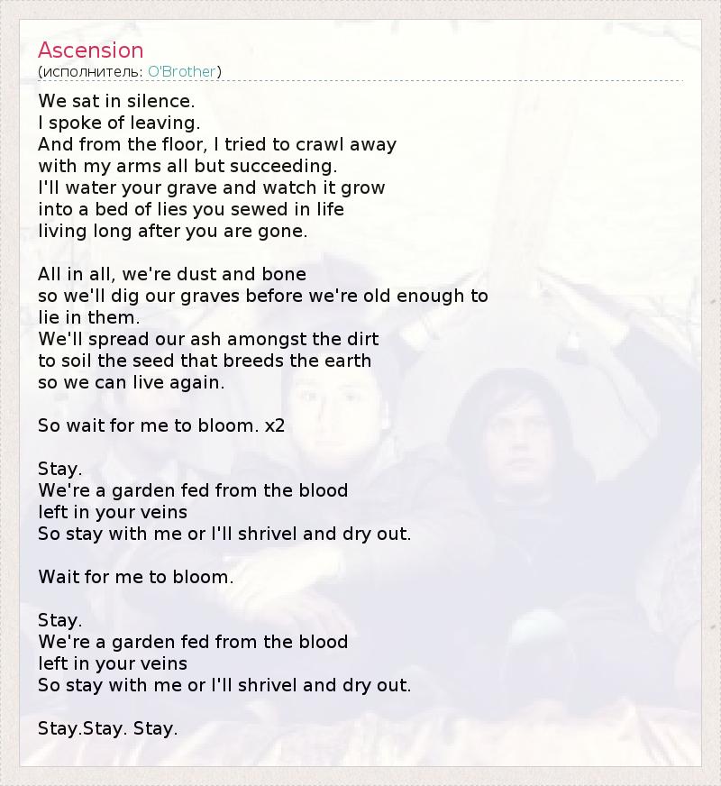We sat in silence. I spoke of leaving. And from the floor, I tried to crawl away with my arms all but succeeding. I'll water your grave and watch it grow into a bed of lies you sewed in life living long after you are gone. All in all, we're dust and bone so we'll dig our graves before we're old enough to lie in them. We'll spread our ash amongst the dirt to soil the seed that breeds the earth so we can live again. So wait for me to bloom. x2 Stay. We're a garden fed from the blood left in your veins So stay with me or I'll shrivel and dry out. Wait for me to bloom. Stay. We're a garden fed from the blood left in your veins So stay with me or I'll shrivel and dry out. Stay.Stay. Stay.