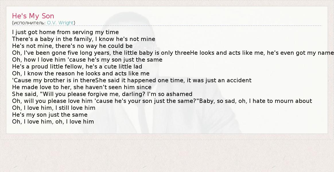 I just got home from serving my time There's a baby in the family, I know he's not mine He's not mine, there's no way he could be Oh, I've been gone five long years, the little baby is only threeHe looks and acts like me, he's even got my name Oh, how I love him 'cause he's my son just the same He's a proud little fellow, he's a cute little lad Oh, I know the reason he looks and acts like me 'Cause my brother is in thereShe said it happened one time, it was just an accident He made love to her, she haven't seen him since She said, "Will you please forgive me, darling? I'm so ashamed Oh, will you please love him 'cause he's your son just the same?"Baby, so sad, oh, I hate to mourn about Oh, I love him, I still love him He's my son just the same Oh, I love him, oh, I love him