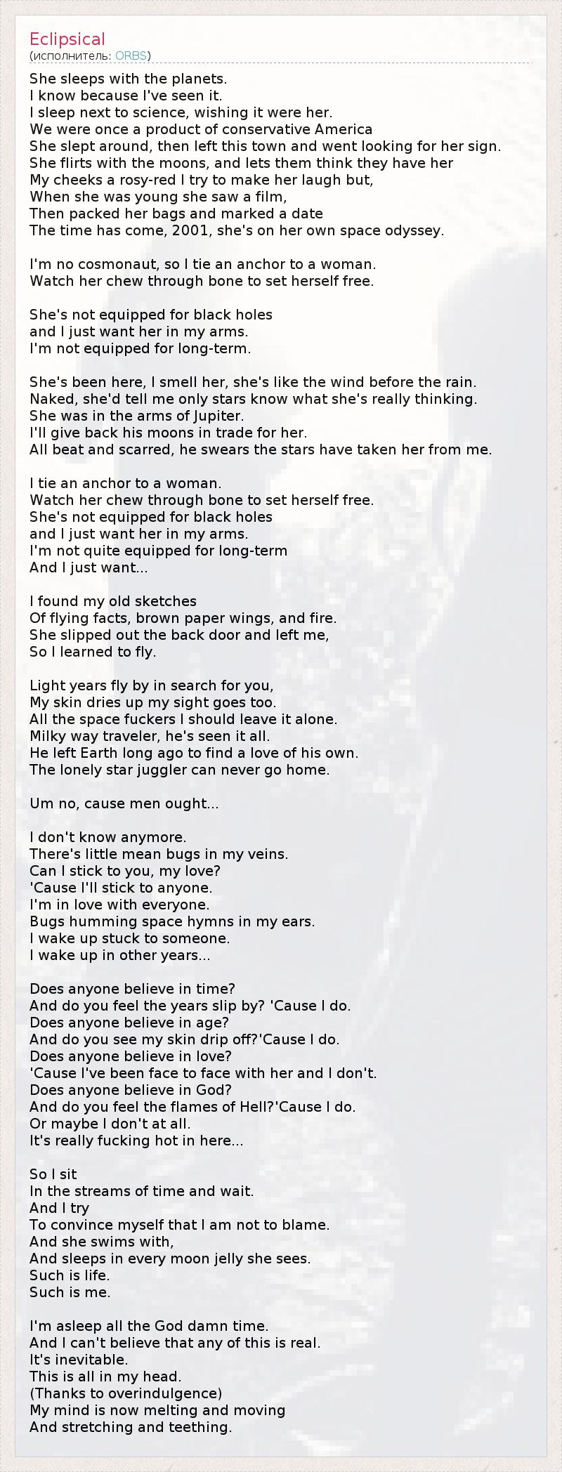 She sleeps with the planets. I know because I've seen it. I sleep next to science, wishing it were her. We were once a product of conservative America She slept around, then left this town and went looking for her sign. She flirts with the moons, and lets them think they have her My cheeks a rosy-red I try to make her laugh but, When she was young she saw a film, Then packed her bags and marked a date The time has come, 2001, she's on her own space odyssey. I'm no cosmonaut, so I tie an anchor to a woman. Watch her chew through bone to set herself free. She's not equipped for black holes and I just want her in my arms. I'm not equipped for long-term. She's been here, I smell her, she's like the wind before the rain. Naked, she'd tell me only stars know what she's really thinking. She was in the arms of Jupiter. I'll give back his moons in trade for her. All beat and scarred, he swears the stars have taken her from me. I tie an anchor to a woman. Watch her chew through bone to set herself free. She's not equipped for black holes and I just want her in my arms. I'm not quite equipped for long-term And I just want... I found my old sketches Of flying facts, brown paper wings, and fire. She slipped out the back door and left me, So I learned to fly. Light years fly by in search for you, My skin dries up my sight goes too. All the space fuckers I should leave it alone. Milky way traveler, he's seen it all. He left Earth long ago to find a love of his own. The lonely star juggler can never go home. Um no, cause men ought... I don't know anymore. There's little mean bugs in my veins. Can I stick to you, my love? 'Cause I'll stick to anyone. I'm in love with everyone. Bugs humming space hymns in my ears. I wake up stuck to someone. I wake up in other years... Does anyone believe in time? And do you feel the years slip by? 'Cause I do. Does anyone believe in age? And do you see my skin drip off?'Cause I do. Does anyone believe in love? 'Cause I've been face to face with her and I don't. Does anyone believe in God? And do you feel the flames of Hell?'Cause I do. Or maybe I don't at all. It's really fucking hot in here... So I sit In the streams of time and wait. And I try To convince myself that I am not to blame. And she swims with, And sleeps in every moon jelly she sees. Such is life. Such is me. I'm asleep all the God damn time. And I can't believe that any of this is real. It's inevitable. This is all in my head. (Thanks to overindulgence) My mind is now melting and moving And stretching and teething.