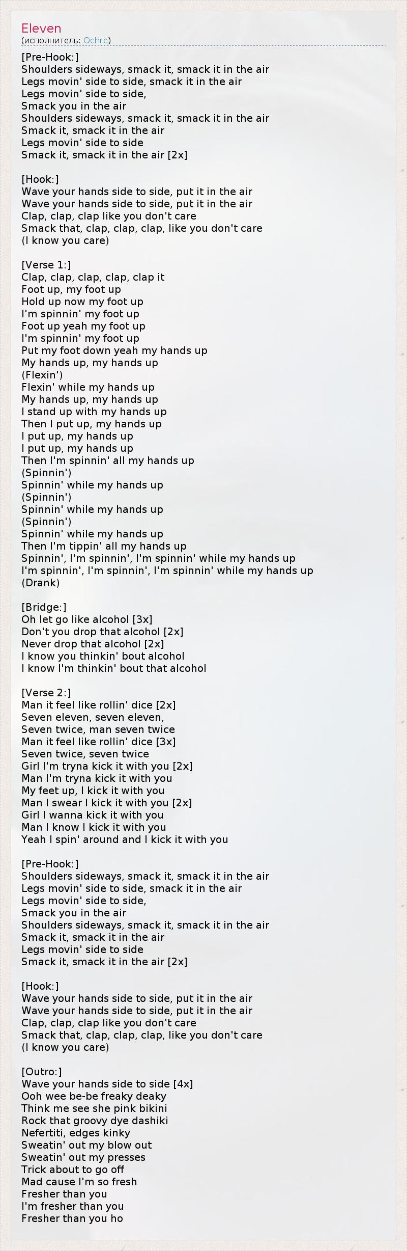 [Pre-Hook:] Shoulders sideways, smack it, smack it in the air Legs movin' side to side, smack it in the air Legs movin' side to side, Smack you in the air Shoulders sideways, smack it, smack it in the air Smack it, smack it in the air Legs movin' side to side Smack it, smack it in the air [2x] [Hook:] Wave your hands side to side, put it in the air Wave your hands side to side, put it in the air Clap, clap, clap like you don't care Smack that, clap, clap, clap, like you don't care (I know you care) [Verse 1:] Clap, clap, clap, clap, clap it Foot up, my foot up Hold up now my foot up I'm spinnin' my foot up Foot up yeah my foot up I'm spinnin' my foot up Put my foot down yeah my hands up My hands up, my hands up (Flexin') Flexin' while my hands up My hands up, my hands up I stand up with my hands up Then I put up, my hands up I put up, my hands up I put up, my hands up Then I'm spinnin' all my hands up (Spinnin') Spinnin' while my hands up (Spinnin') Spinnin' while my hands up (Spinnin') Spinnin' while my hands up Then I'm tippin' all my hands up Spinnin', I'm spinnin', I'm spinnin' while my hands up I'm spinnin', I'm spinnin', I'm spinnin' while my hands up (Drank) [Bridge:] Oh let go like alcohol [3x] Don't you drop that alcohol [2x] Never drop that alcohol [2x] I know you thinkin' bout alcohol I know I'm thinkin' bout that alcohol [Verse 2:] Man it feel like rollin' dice [2x] Seven eleven, seven eleven, Seven twice, man seven twice Man it feel like rollin' dice [3x] Seven twice, seven twice Girl I'm tryna kick it with you [2x] Man I'm tryna kick it with you My feet up, I kick it with you Man I swear I kick it with you [2x] Girl I wanna kick it with you Man I know I kick it with you Yeah I spin' around and I kick it with you [Pre-Hook:] Shoulders sideways, smack it, smack it in the air Legs movin' side to side, smack it in the air Legs movin' side to side, Smack you in the air Shoulders sideways, smack it, smack it in the air Smack it, smack it in the air Legs movin' side to side Smack it, smack it in the air [2x] [Hook:] Wave your hands side to side, put it in the air Wave your hands side to side, put it in the air Clap, clap, clap like you don't care Smack that, clap, clap, clap, like you don't care (I know you care) [Outro:] Wave your hands side to side [4x] Ooh wee be-be freaky deaky Think me see she pink bikini Rock that groovy dye dashiki Nefertiti, edges kinky Sweatin' out my blow out Sweatin' out my presses Trick about to go off Mad cause I'm so fresh Fresher than you I'm fresher than you Fresher than you ho