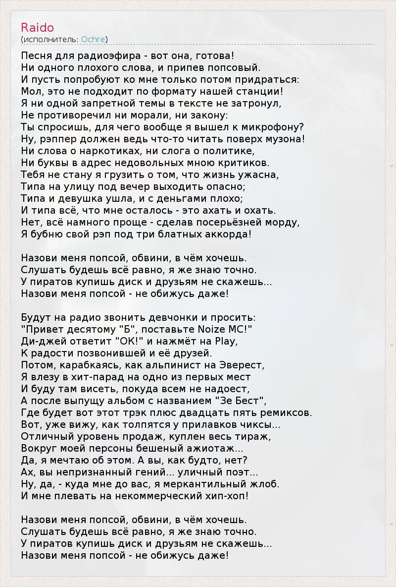 Песня для радиоэфира - вот она, готова! Ни одного плохого слова, и припев попсовый. И пусть попробуют ко мне только потом придраться: Мол, это не подходит по формату нашей станции! Я ни одной запретной темы в тексте не затронул, Не противоречил ни морали, ни закону: Ты спросишь, для чего вообще я вышел к микрофону? Ну, рэппер должен ведь что-то читать поверх музона! Ни слова о наркотиках, ни слога о политике, Ни буквы в адрес недовольных мною критиков. Тебя не стану я грузить о том, что жизнь ужасна, Типа на улицу под вечер выходить опасно; Типа и девушка ушла, и с деньгами плохо; И типа всё, что мне осталось - это ахать и охать. Нет, всё намного проще - сделав посерьёзней морду, Я бубню свой рэп под три блатных аккорда! Назови меня попсой, обвини, в чём хочешь. Слушать будешь всё равно, я же знаю точно. У пиратов купишь диск и друзьям не скажешь... Назови меня попсой - не обижусь даже! Будут на радио звонить девчонки и просить: "Привет десятому "Б", поставьте Noize MC!" Ди-джей ответит "ОК!" и нажмёт на Play, К радости позвонившей и её друзей. Потом, карабкаясь, как альпинист на Эверест, Я влезу в хит-парад на одно из первых мест И буду там висеть, покуда всем не надоест, А после выпущу альбом с названием "Зе Бест", Где будет вот этот трэк плюс двадцать пять ремиксов. Вот, уже вижу, как толпятся у прилавков чиксы... Отличный уровень продаж, куплен весь тираж, Вокруг моей персоны бешеный ажиотаж... Да, я мечтаю об этом. А вы, как будто, нет? Ах, вы непризнанный гений... уличный поэт... Ну, да, - куда мне до вас, я меркантильный жлоб. И мне плевать на некоммерческий хип-хоп! Назови меня попсой, обвини, в чём хочешь. Слушать будешь всё равно, я же знаю точно. У пиратов купишь диск и друзьям не скажешь... Назови меня попсой - не обижусь даже!