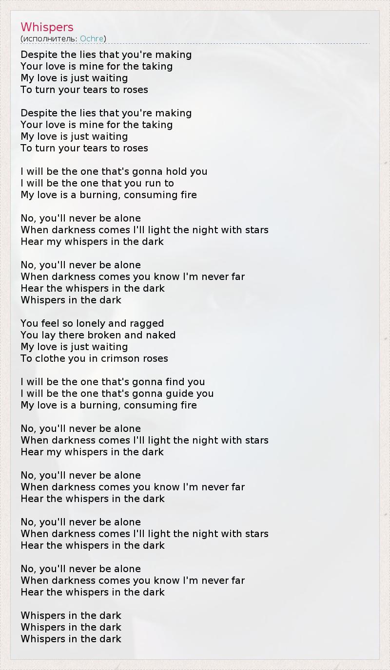 Несмотря на ложь, что ты говоришь, Твоё сердце принадлежит мне. Моя любовь лишь ждет, Чтобы превратить твои слезы в лепестки роз. Несмотря на ложь, что ты говоришь, Твоё сердце принадлежит мне. Моя любовь только и ждёт, Чтобы превратить твои слёзы в лепестки роз. Я буду тем, кто обнимет тебя, Я буду тем, к кому ты побежишь. Моя любовь – пылающий, сжигающий огонь. Нет, ты больше не будешь одна! Когда наступит ночь, я зажгу звёзды в небесах. Только услышь мой шёпот во тьме... Нет, ты больше не будешь одна! Когда наступает ночь, ты же знаешь, что я всегда рядом. Только услышь мой шёпот во тьме, Шёпот во тьме. Ты чувствуешь себя одинокой и разбитой. Ты лежала там, сокрушённая и беззащитная... Моя любовь только и ждёт, Чтобы облачить тебя в алые розы. Я буду тем, кто найдет тебя, Я буду тем, кто поведёт тебя за собой. Моя любовь – пылающий, сжигающий огонь... Нет, ты больше не будешь одна! Когда наступит ночь, я зажгу звёзды в небесах. Только услышь мой шёпот во тьме... Нет, ты больше не будешь одна! Когда наступает ночь, ты же знаешь, что я всегда рядом. Только услышь мой шёпот во тьме, Шёпот во тьме. Когда наступит ночь, я буду зажигать звезды в небесах Лишь услышь мой шепот во тьме Нет, ты больше не будешь одна! Когда наступает ночь, ты же знаешь, что я всегда рядом. Только услышь мой шёпот во тьме. Шёпот во тьме, Шёпот во тьме, Шёпот во тьме...