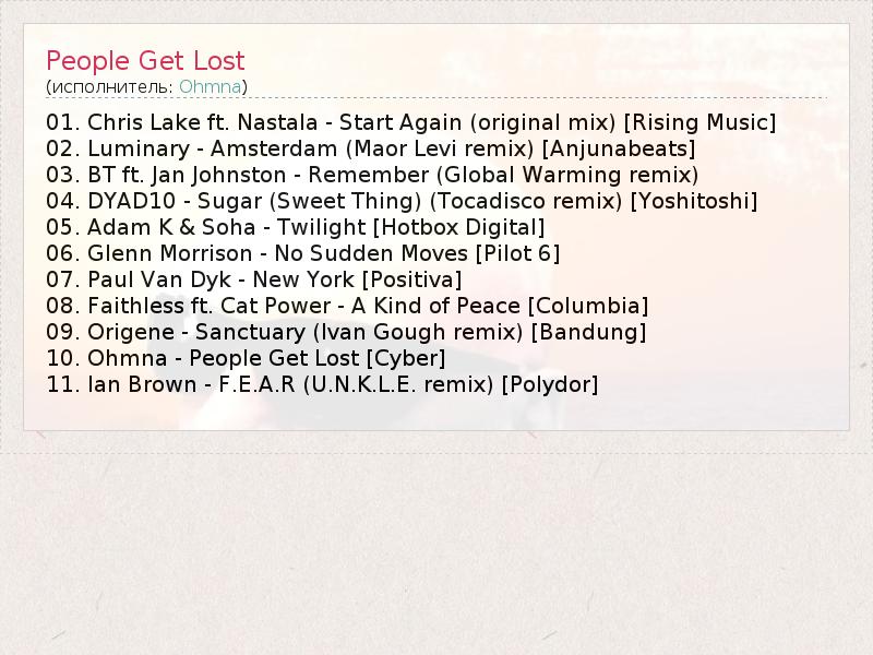 01. Chris Lake ft. Nastala - Start Again (original mix) [Rising Music] 02. Luminary - Amsterdam (Maor Levi remix) [Anjunabeats] 03. BT ft. Jan Johnston - Remember (Global Warming remix) 04. DYAD10 - Sugar (Sweet Thing) (Tocadisco remix) [Yoshitoshi] 05. Adam K & Soha - Twilight [Hotbox Digital] 06. Glenn Morrison - No Sudden Moves [Pilot 6] 07. Paul Van Dyk - New York [Positiva] 08. Faithless ft. Cat Power - A Kind of Peace [Columbia] 09. Origene - Sanctuary (Ivan Gough remix) [Bandung] 10. Ohmna - People Get Lost [Cyber] 11. Ian Brown - F.E.A.R (U.N.K.L.E. remix) [Polydor]