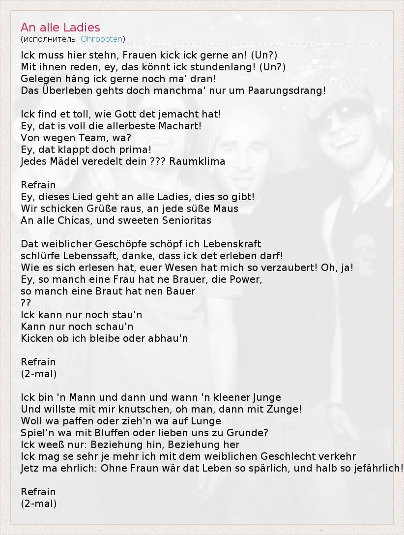 Ик беспорядок иерархи Stehn , Фрауен удар Ик Gerne! ( Un ? ) Mit Ihnen Реден , эй , дас könnt Ик stundenlang ! ( Un ? ) Gelegen повесить Ик Gerne Ночь ма ' дрань ! Das Überleben Gehts Дочь manchma «Нур гм Paarungsdrang ! Ик найти ET платной , Ви Готт йе jemacht шляпу! Еу , DAT является Фолля умереть allerbeste Machart ! Фон Wegen игрока , ва ? Еу , DAT klappt DOCH прима ! Jedes Mädel veredelt Dein ? ? Raumklima воздерживаться Еу , Dieses Lied Gehtалле дамы , умирает так gibt ! Wir schicken Grüße Раус ,Jede süße Маус Алле Chicas , унд подсластить Senioritas Дат weiblicher Geschöpfe Schöpf ич Lebenskraft schlürfe Lebenssaft , Danke , Dass Ик опр Erleben DARF ! Ви -эс- Сич erlesen шляпа, euer Wesen шляпа Mich так verzaubert ! О, JA ! Еу , так Manch Eine Frau шляпа пе Брауэра , умирают Сила , так Manch Eine Braut шляпа нен Бауэр ? Ик канн нур Ночь stau'n Канн нур Ночь schau'n Kicken -об ич bleibe Одер abhau'n воздерживаться (2- мал ) Ик бен -н Манн унд Данн унд Wann -н kleener Юнге Und willste мит мир knutschen , о человек , Данн мит Zunge ! Уолл ва Паффен Одер zieh'n ва Ауф Выпад Spiel'n ва мит Bluffen Одер Lieben UNS цу Grunde ? Ик weeß нур : Beziehung хин , Beziehung ее Ик маг себе Sehr JE Mehr ич мит дем weiblichen Geschlecht Verkehr Jetz ма Эрлих : Ohne Fraun войны DAT Leben так spärlich , унд HALB так jefährlich ! воздерживаться (2- мал )