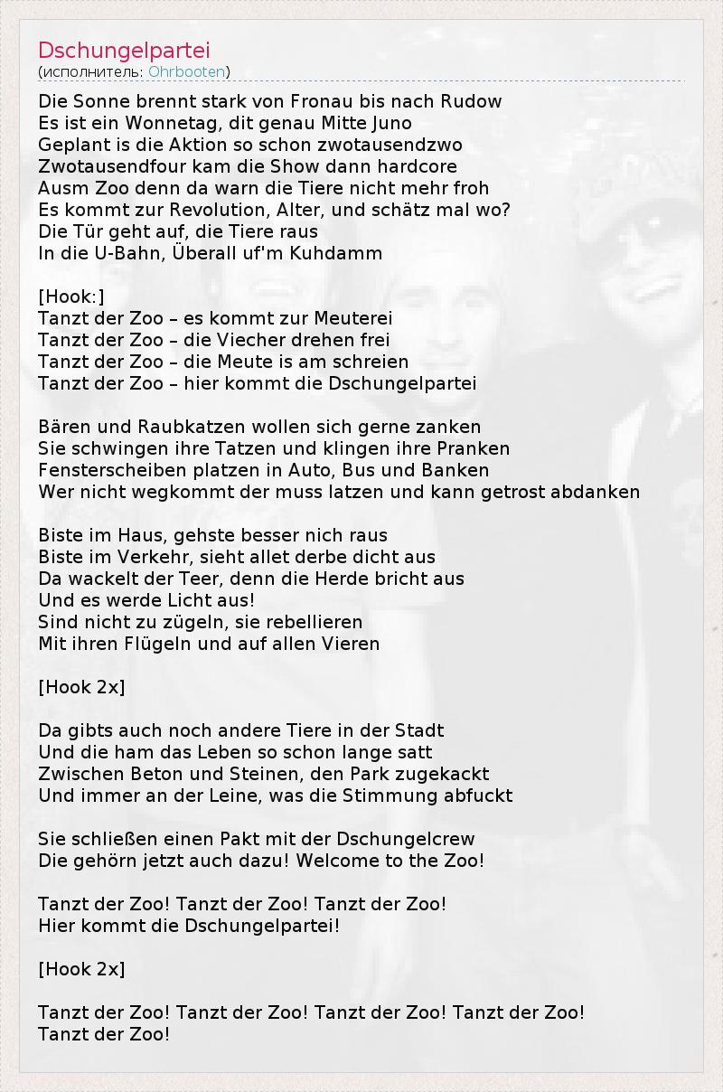 Die Sonne brennt stark von Fronau bis nach Rudow Es ist ein Wonnetag, dit genau Mitte Juno Geplant is die Aktion so schon zwotausendzwo Zwotausendfour kam die Show dann hardcore Ausm Zoo denn da warn die Tiere nicht mehr froh Es kommt zur Revolution, Alter, und schätz mal wo? Die Tür geht auf, die Tiere raus In die U-Bahn, Überall uf'm Kuhdamm [Hook:] Tanzt der Zoo – es kommt zur Meuterei Tanzt der Zoo – die Viecher drehen frei Tanzt der Zoo – die Meute is am schreien Tanzt der Zoo – hier kommt die Dschungelpartei Bären und Raubkatzen wollen sich gerne zanken Sie schwingen ihre Tatzen und klingen ihre Pranken Fensterscheiben platzen in Auto, Bus und Banken Wer nicht wegkommt der muss latzen und kann getrost abdanken Biste im Haus, gehste besser nich raus Biste im Verkehr, sieht allet derbe dicht aus Da wackelt der Teer, denn die Herde bricht aus Und es werde Licht aus! Sind nicht zu zügeln, sie rebellieren Mit ihren Flügeln und auf allen Vieren [Hook 2x] Da gibts auch noch andere Tiere in der Stadt Und die ham das Leben so schon lange satt Zwischen Beton und Steinen, den Park zugekackt Und immer an der Leine, was die Stimmung abfuckt Sie schließen einen Pakt mit der Dschungelcrew Die gehörn jetzt auch dazu! Welcome to the Zoo! Tanzt der Zoo! Tanzt der Zoo! Tanzt der Zoo! Hier kommt die Dschungelpartei! [Hook 2x] Tanzt der Zoo! Tanzt der Zoo! Tanzt der Zoo! Tanzt der Zoo! Tanzt der Zoo!